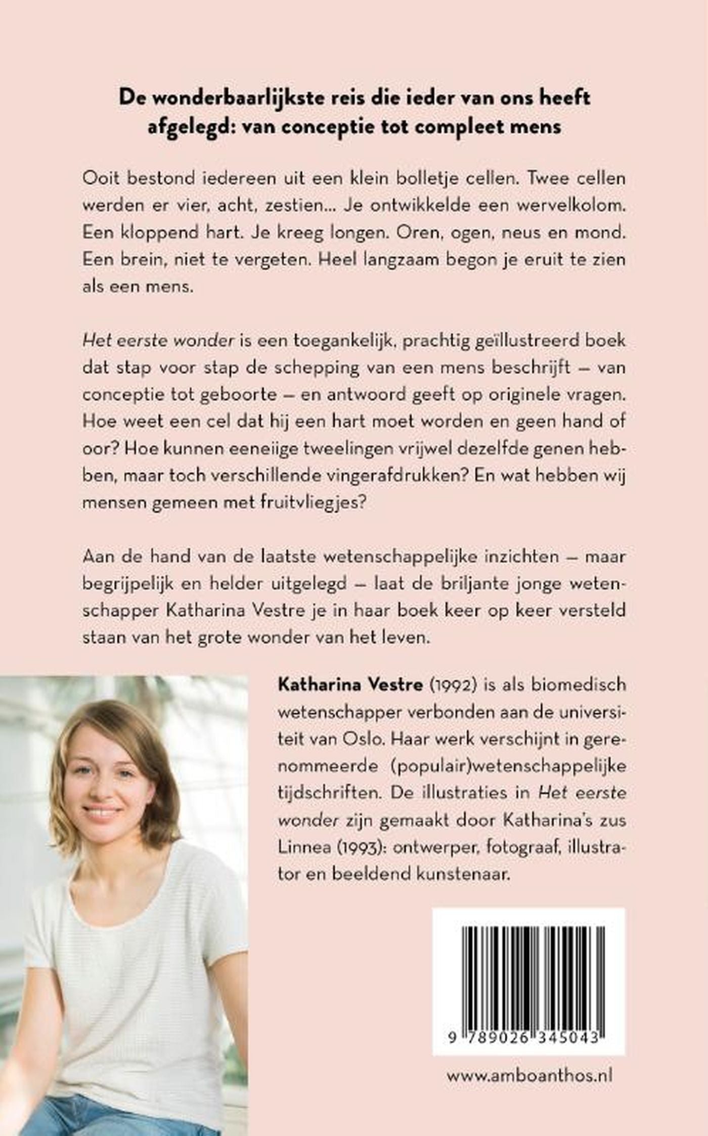 ‘Het eerste wonder’ van Katharina Vestre is populaire wetenschap op zijn best, over de wonderbaarlijke reis die we allemaal hebben afgelegd: van zaad- en eicel tot volwaardig mens. Hoeveel we als mensen ook onderling verschillen, één ding hebben we in elk geval met elkaar gemeen: allemaal bivakkeerden we voordat we ter wereld kwamen maandenlang in de buik van onze moeder. Je staat er niet elke dag bij stil, maar geen enkele periode in het leven is zo bepalend geweest voor wie je nu bent als die (gemiddeld) 280 dagen. En van geen enkele periode in je leven herinner je je ook zo weinig, of beter gezegd: helemaal niets.