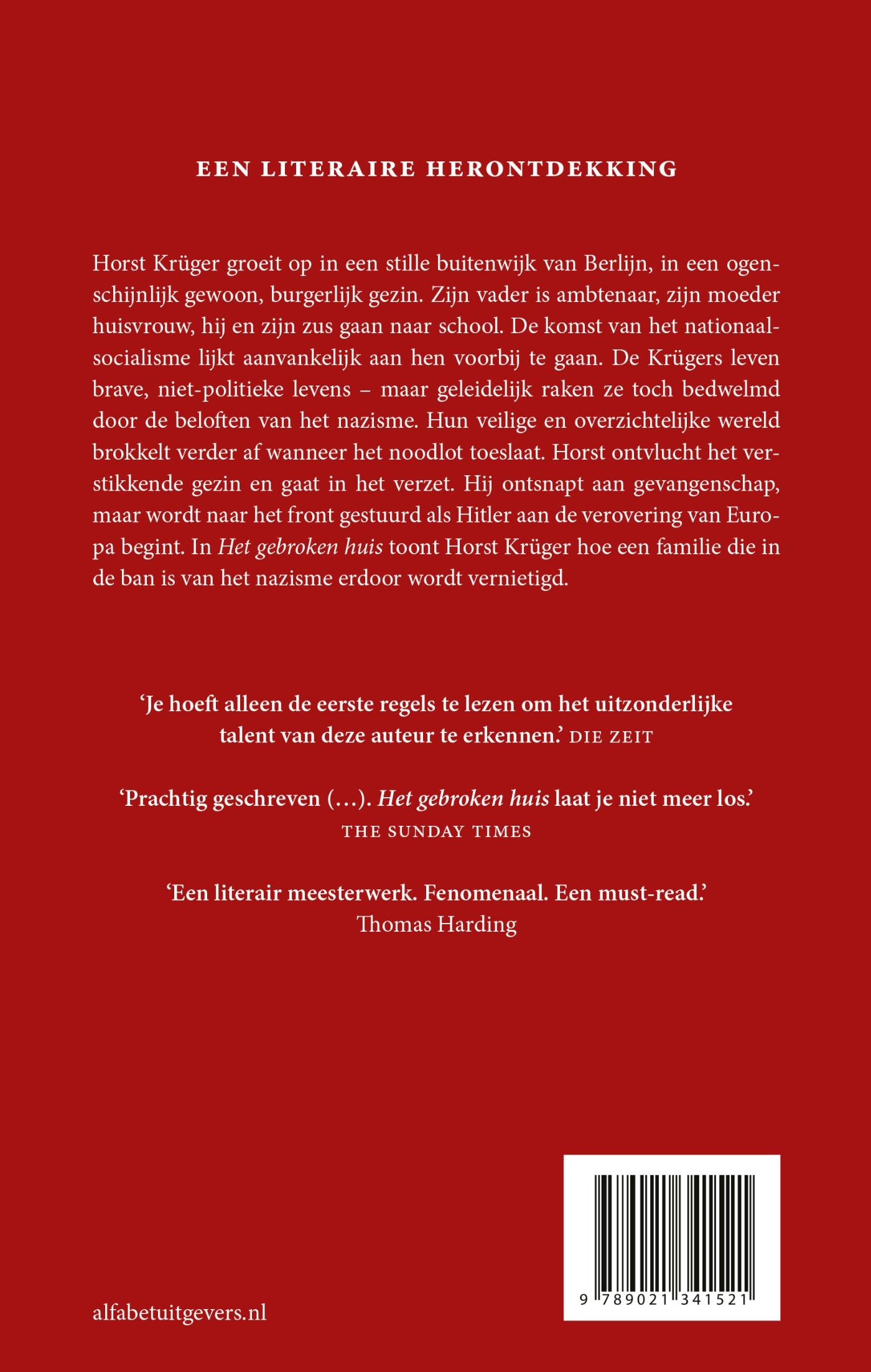 Horst Krüger groeit op in een stille buitenwijk van Berlijn, in een doodgewoon gezin. Zijn vader is ambtenaar, zijn moeder huisvrouw, hij en zijn zus gaan naar school. De komst van het nationaalsocialisme lijkt aanvankelijk aan hen voorbij te gaan. Hier leven mensen brave, niet-politieke levens – maar geleidelijk raken ze toch bedwelmd door de beloften van het nazisme. Deze veilige en overzichtelijke wereld brokkelt verder af wanneer het noodlot toeslaat. Krüger ontvlucht het verstikkende gezin en gaat in het verzet. Hij ontsnapt aan gevangenschap, maar wordt naar het front gestuurd als Hitler aan de verovering van Europa begint. In ‘Het gebroken huis’ toont Krüger hoe een familie die in de ban is van het nazisme erdoor wordt vernietigd.