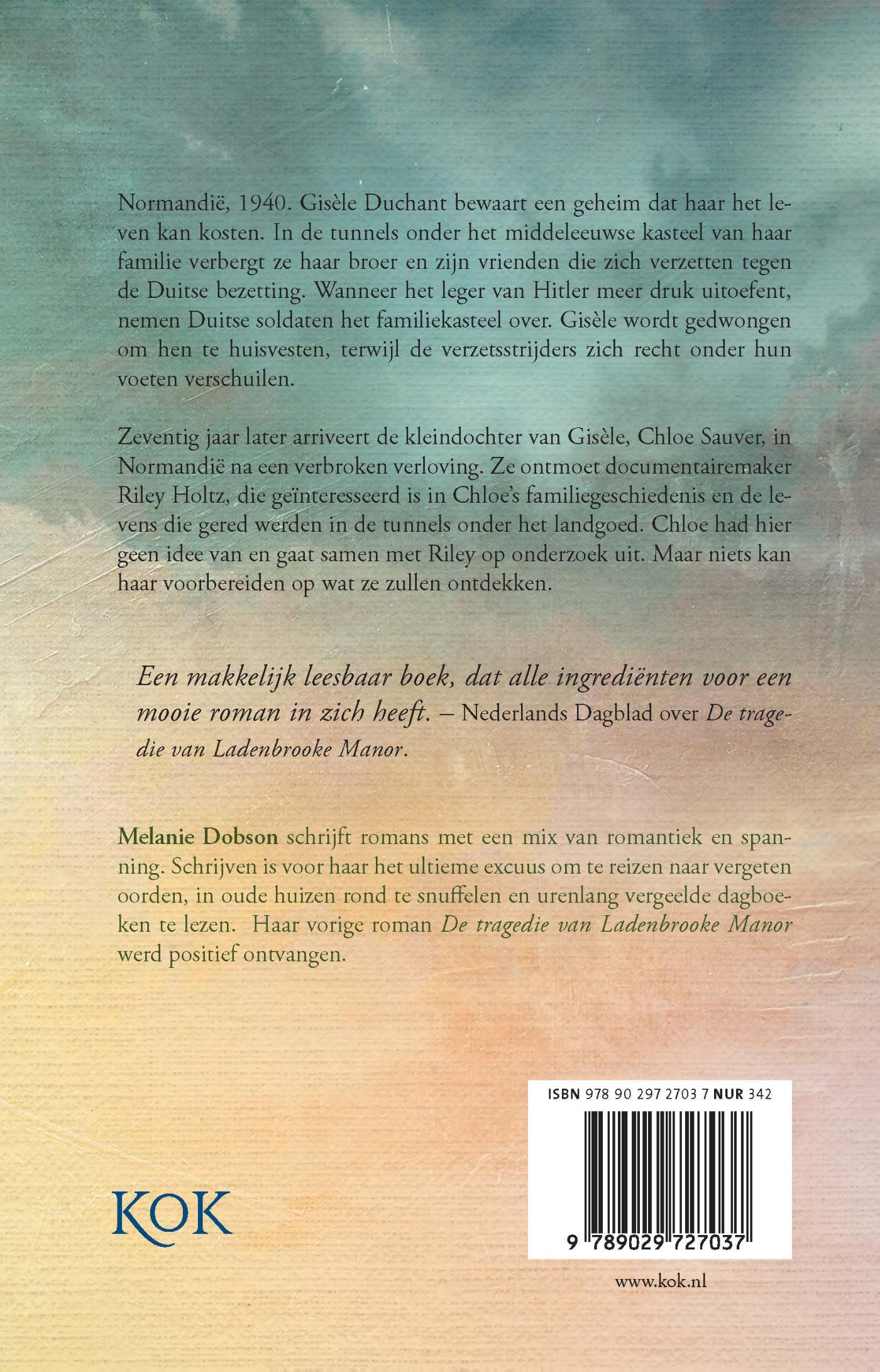 ‘Het geheim van Chateau d’Epines’ van Melanie Dobson vertelt het spannende en meeslepende verhaal van een jonge Franse vrouw die tijdens de Tweede Wereldoorlog haar leven riskeert om verzetsstrijders te verbergen in een gangenstelsel onder het landgoed waar zij woont. Zeventig jaar later zoekt haar kleindochter haar toevlucht tot het landgoed om een relatiebreuk te ontvluchten en aan een oorlogsdocumentaire te werken. Ze is geschokt wanneer ze ontdekt welke rol het familiehuis in de oorlog gespeeld heeft. Maar als ze het gangenstelsel onder het landgoed begint te verkennen, ontdekt ze dat haar oma nog veel meer geheimen heeft bewaard.