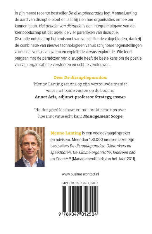 ‘Het geheim van disruptie’ van Menno Lanting is een integrale uitgave van de kernboodschap uit zijn meest recente bestseller ‘De disruptieparadox’: de vier paradoxen van disruptie. Lanting legt in dat boek de aard van disruptie bloot en laat zien hoe organisaties ermee om kunnen gaan.