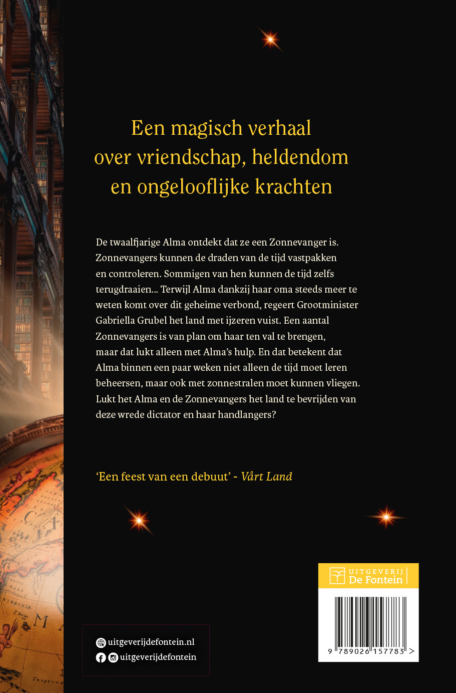 De twaalfjarige Alma ontdekt dat ze een Zonnevanger is. Zonnevangers kunnen de draden van de tijd vastpakken en controleren. Sommigen van hen kunnen de tijd zelfs terugdraaien... Terwijl Alma dankzij haar oma steeds meer te weten komt over dit geheime verbond, regeert Grootminister Gabriella Grubel het land met ijzeren vuist. Een aantal Zonnevangers is van plan om haar ten val te brengen, maar dat lukt alleen met Alma's hulp. En dat betekent dat Alma binnen een paar weken niet alleen de tijd moet leren beheersen, maar ook met zonnestralen moet kunnen vliegen. Lukt het Alma en de Zonnevangers om een ramp te voorkomen en het land te bevrijden van deze wrede dictator en haar handlangers?