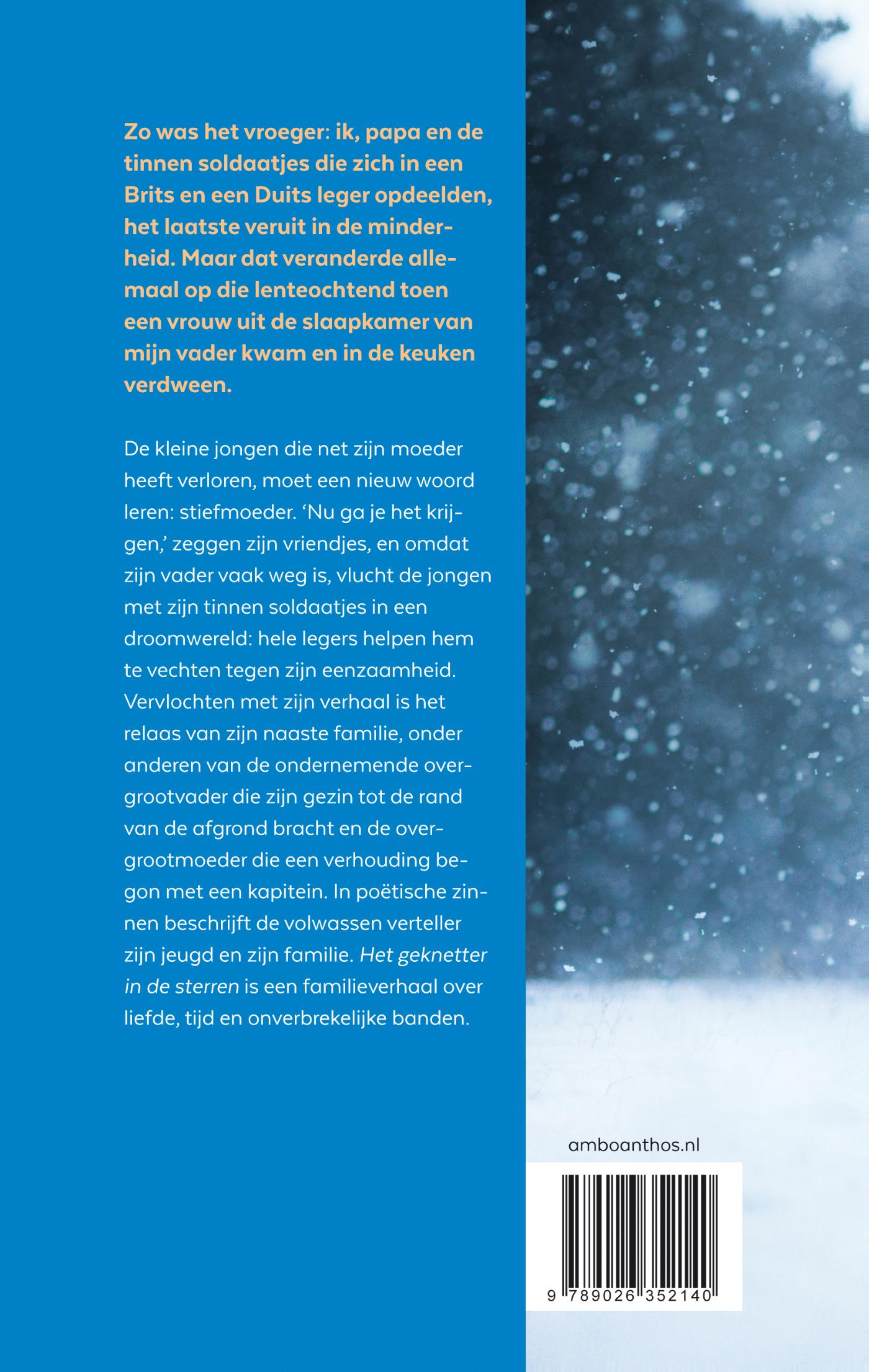 In Het geknetter in de sterren van Jón Kalman Stefánsson moet de kleine jongen die net zijn moeder heeft verloren een nieuw woord leren: stiefmoeder. ‘Nu ga je het krijgen,’ zeggen zijn vriendjes als de jongen een stiefmoeder krijgt, en omdat zijn vader vaak weg is, vlucht de jongen met zijn tinnen soldaatjes in een droomwereld: hele legers helpen hem te strijden tegen zijn eenzaamheid. Hij krijgt ook aandacht van zijn grootmoeder, die hem verhalen vertelt over haar ouders: de ondernemende overgrootvader die de familie tot aan de afgrond bracht en de overgrootmoeder die afsprak met een kapitein. In poëtische zinnen vangt de volwassen verteller zijn jeugd en zijn familie.