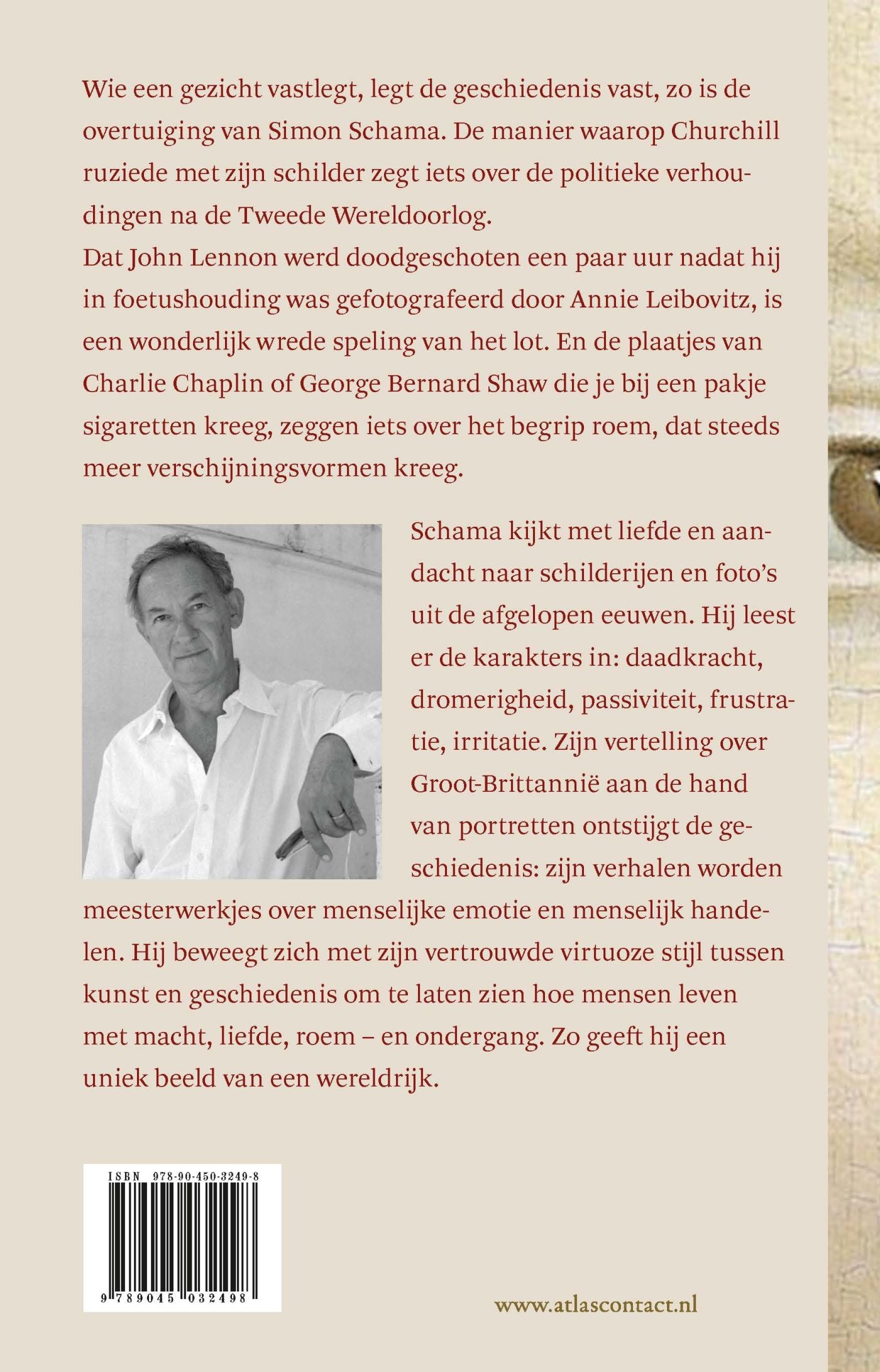 Wie een gezicht vastlegt, legt de geschiedenis vast, zo is de overtuiging van Simon Schama. De manier waarop Churchill ruziede met zijn schilder zegt iets over de politieke verhoudingen na de Tweede Wereldoorlog. Dat John Lennon een paar uur nadat hij in foetushouding was gefotografeerd door Annie Leibovitz, werd doodgeschoten is een wonderlijk wrede speling van het lot. En de plaatjes van Charlie Chaplin of George Bernard Shaw die je bij een pakje sigaretten kreeg, zeggen iets over het begrip roem, dat steeds meer verschijningsvormen kreeg. Schama kijkt met liefde en aandacht naar schilderijen en foto’s uit de afgelopen eeuwen. Hij leest er de karakters in: daadkracht, dromerigheid, passiviteit, frustratie, irritatie. Zijn vertelling over Groot-Brittannië aan de hand van portretten ontstijgt de geschiedenis: zijn verhalen worden meesterwerkjes over menselijke emotie en menselijk handelen. Hij beweegt zich met vertrouwde, stilistische virtuositeit tussen kunst en geschiedenis om te laten zien hoe mensen leven met macht, liefde, roem – en ondergang. Zo geeft hij een uniek beeld van een wereldrijk