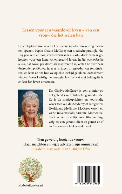 In een tijd dat vrouwen niet eens een eigen bankrekening mochten openen, begon Gladys McGary een medische praktijk. Nu, 103 jaar oud en nog steeds werkzaam als arts, deelt ze haar geheimen voor een lang, vol en gezond leven. In Het goedgeleefde leven, dat zowel praktisch als inspirerend is, vertelt ze over haar duizenden patiënten, haar ervaringen als moeder van zes kinderen, en leert ze ons hoe we op elke leeftijd geluk en levenskracht vinden. Wees kwistig met energie, laat los wat niet belangrijk is en leer het leven omarmen.