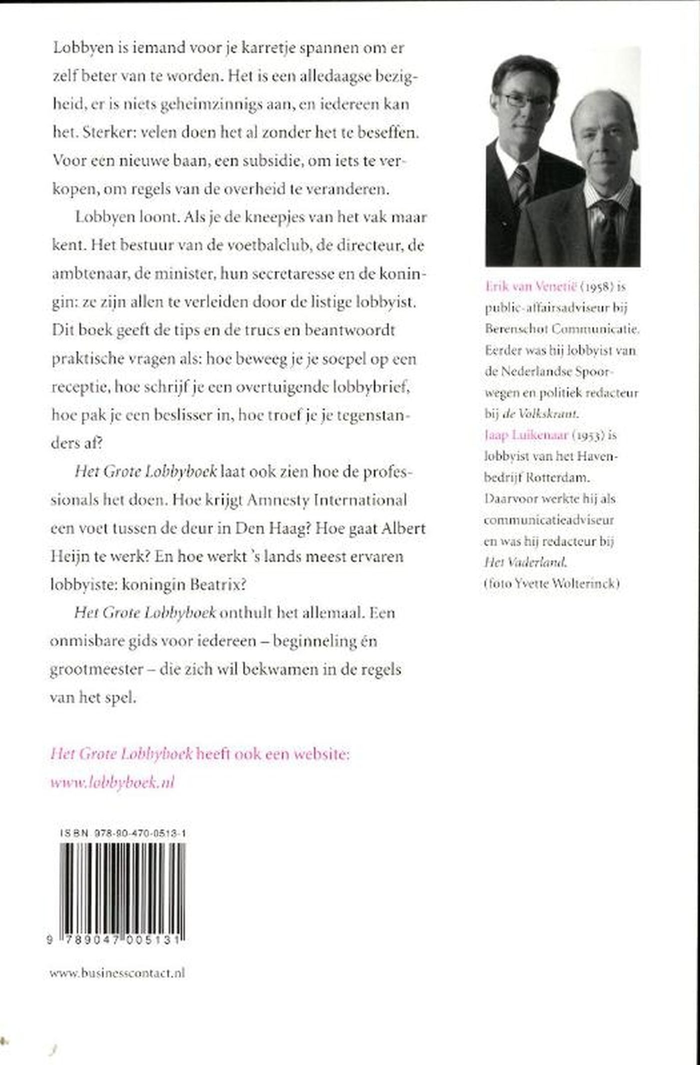 Het Grote Lobbyboek laat ook zien hoe de professionals het doen. Hoe krijgt Amnesty International een voet tussen de deur in Den Haag? Hoe gaat Albert Heijn te werk? En hoe werkt s lands meest ervaren lobbyiste: koningin Beatrix? Het Grote Lobbyboek onthult het allemaal. Een onmisbare gids voor iedereen beginneling én grootmeester die zich wil bekwamen in de regels van het spel.