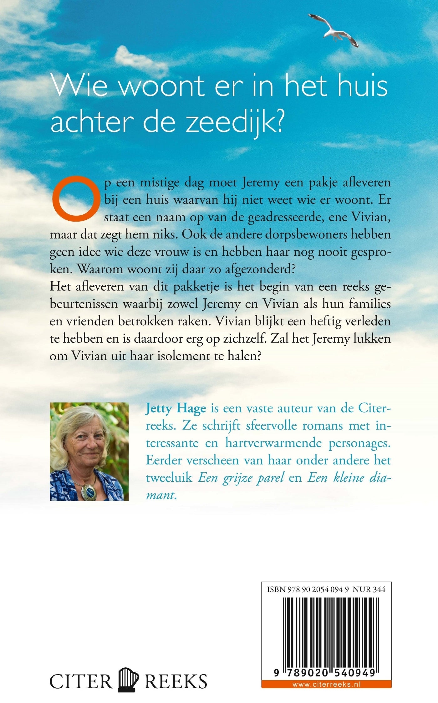 In ‘Het huis achter de zeedijk’ van Jetty Hage woont al jaren een vrouw in een huis achter de zeedijk, maar niemand in het Zeeuwse dorp kent haar of heeft haar ooit gesproken. Waarom woont zij daar zo afgezonderd? Als dorpsbewoner Jeremy daar een pakje moet afgeven, wordt er niet opengedaan, maar door het adres op het pakje weet hij nu wel dat ze Vivian heet. Jeremy deelt het met zijn familie en samen proberen ze Vivian uit haar isolement te trekken, maar dat blijkt nog niet zo gemakkelijk te zijn…