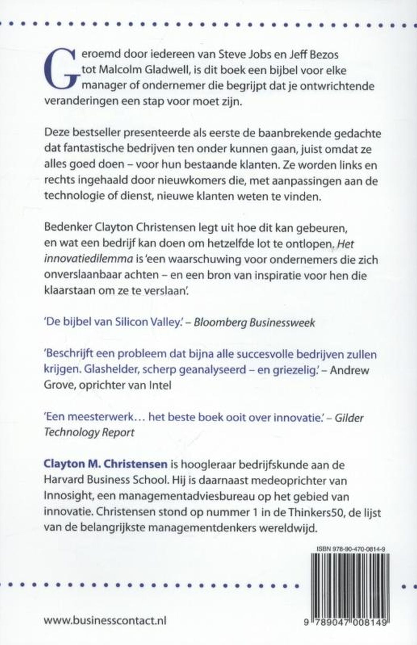 Bedenker Clayton Christensen legt uit hoe dit kan gebeuren, en wat een bedrijf kan doen om hetzelfde lot te ontlopen. Het innovatiedilemma is ‘een waarschuwing voor ondernemers die zich onverslaanbaar achten – en een bron van inspiratie voor hen die klaarstaan om ze te verslaan’.
