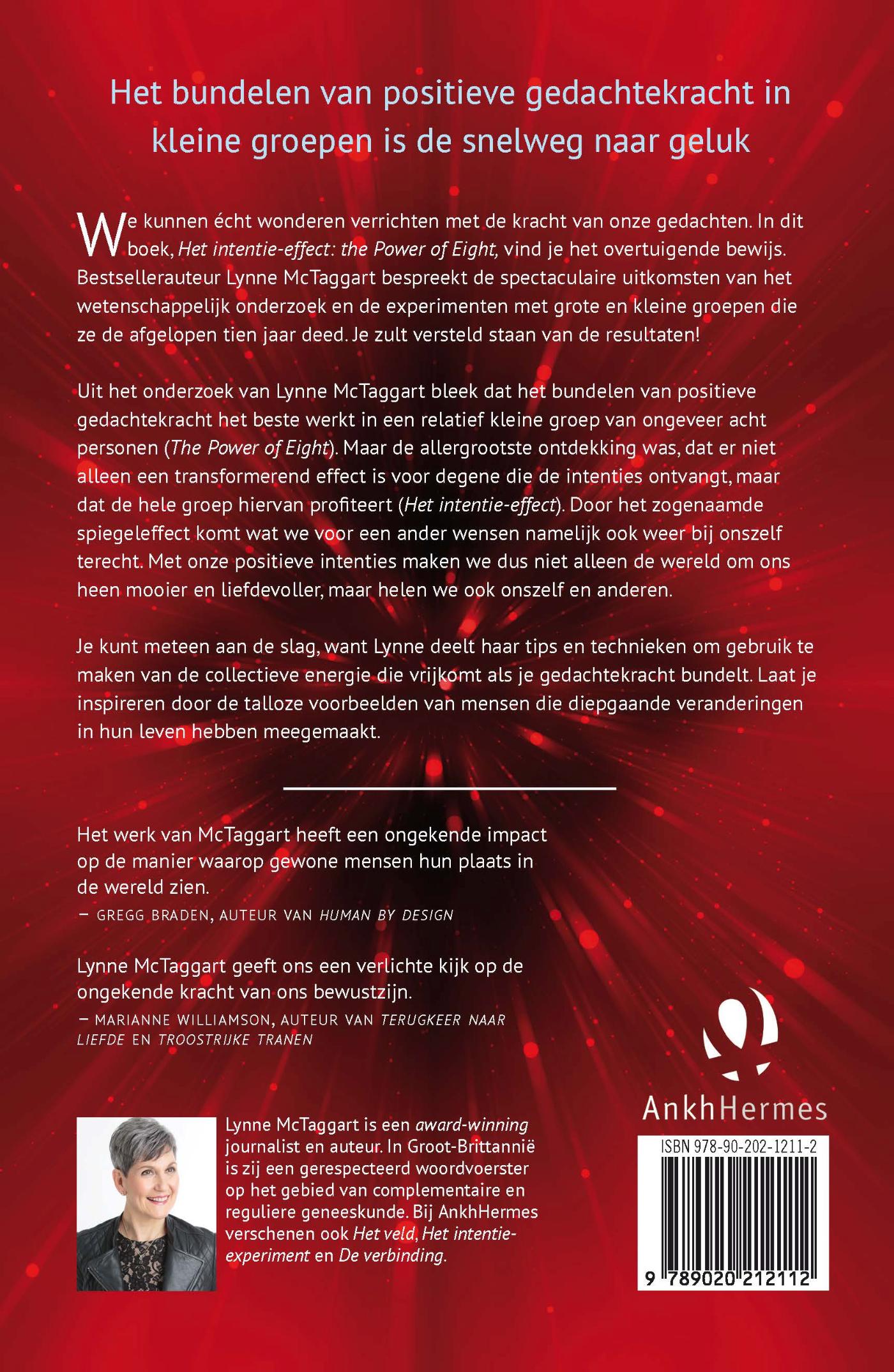 In 'Het Intentie-effect: The Power of Eight' geeft Lynne McTaggart wetenschappelijke context aan alle wonderen die ze aanschouwde. Ze dook in de geschiedenis van het fenomeen gedachtekracht en organiseerde een grote onafhankelijke wetenschappelijke studie met 'Power of Eight' groepen om aan te kunnen tonen waarom positieve gedachtekracht bundelen in kleine groepen de snelweg is naar geluk.