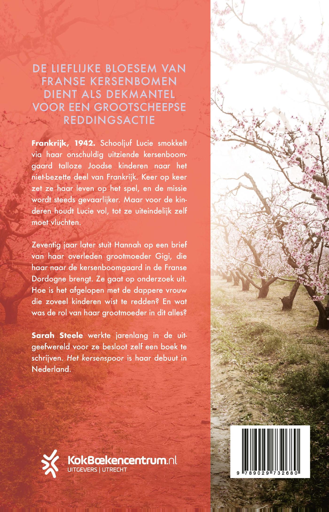 In ‘Het kersenspoor’ van Sarah Steele redt een dappere schooljuf tijdens de Tweede Wereldoorlog het leven van talloze Joodse kinderen. De kersenboomgaard waar zij woont vormt het middelpunt van wat de ‘kersenroute’ genoemd wordt. Via deze route worden de kinderen naar het niet-bezette deel van Frankrijk gesmokkeld. Maar de missie wordt steeds gevaarlijker…