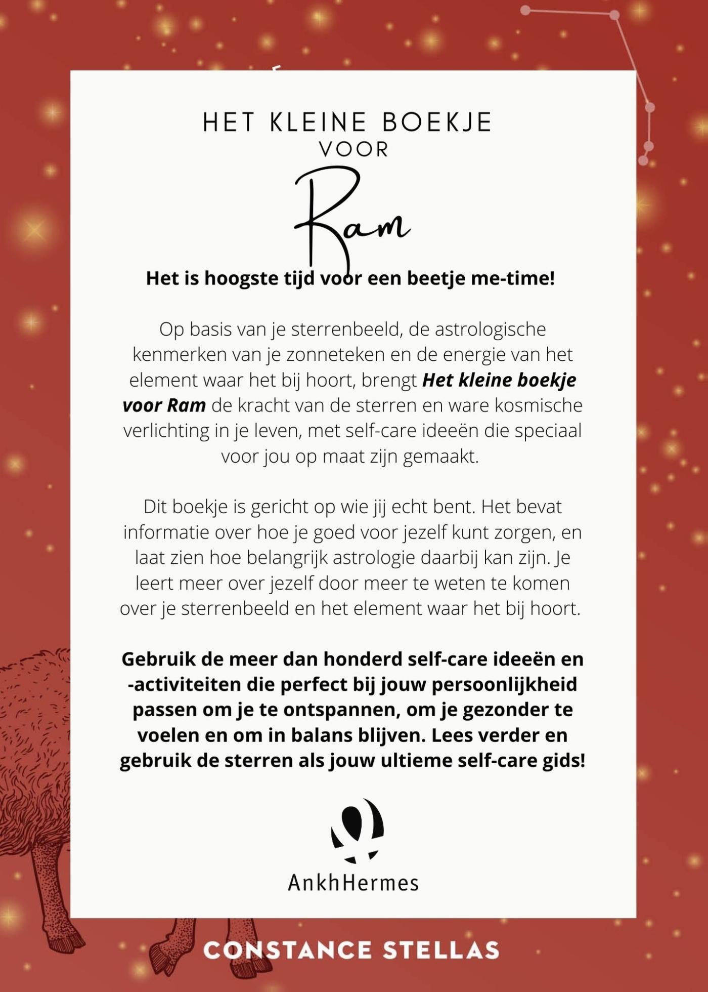 Het is hoogste tijd voor een beetje me-time! Op basis van je sterrenbeeld, de astrologische kenmerken van je zonneteken en de energie van het element waar het bij hoort, brengt Het kleine boekje voor Ram de kracht van de sterren en ware kosmische verlichting in je leven, met self-care ideeën die speciaal voor jou op maat zijn gemaakt. Dit boekje is gericht op wie jij echt bent. Het bevat informatie over hoe je goed voor jezelf kunt zorgen, en laat zien hoe belangrijk astrologie daarbij kan zijn. Je leert meer over jezelf door meer te weten te komen over je sterrenbeeld en het element waar het bij hoort. Gebruik de meer dan honderd self-care ideeën en -activiteiten die perfect bij jouw persoonlijkheid passen om je te ontspannen, om je gezonder te voelen en om in balans blijven. Lees verder en gebruik de sterren als jouw ultieme self-care gids!