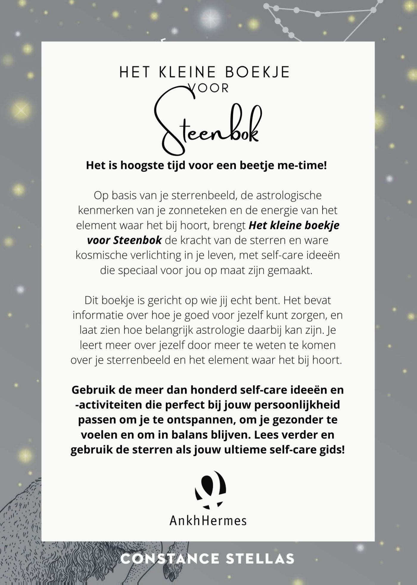 Het is hoogste tijd voor een beetje me-time! Op basis van je sterrenbeeld, de astrologische kenmerken van je zonneteken en de energie van het element waar het bij hoort, brengt Het kleine boekje voor Steenbok de kracht van de sterren en ware kosmische verlichting in je leven, met self-care ideeën die speciaal voor jou op maat zijn gemaakt. Dit boekje is gericht op wie jij echt bent. Het bevat informatie over hoe je goed voor jezelf kunt zorgen, en laat zien hoe belangrijk astrologie daarbij kan zijn. Je leert meer over jezelf door meer te weten te komen over je sterrenbeeld en het element waar het bij hoort. Gebruik de meer dan honderd self-care ideeën en -activiteiten die perfect bij jouw persoonlijkheid passen om je te ontspannen, om je gezonder te voelen en om in balans blijven. Lees verder en gebruik de sterren als jouw ultieme self-care gids!