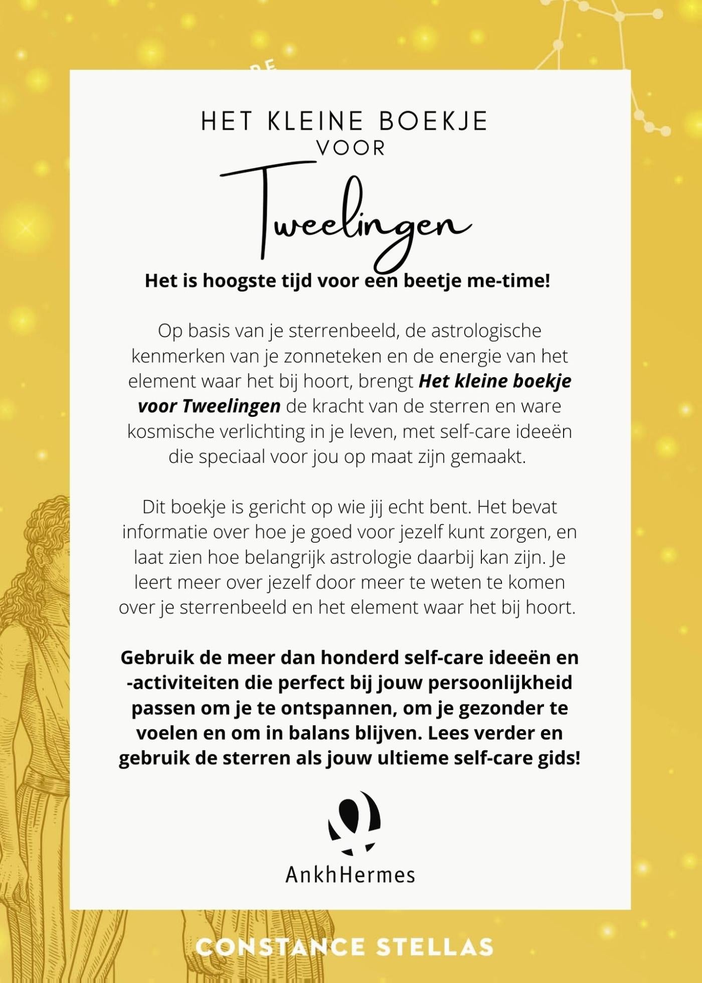 Het is hoogste tijd voor een beetje me-time! Op basis van je sterrenbeeld, de astrologische kenmerken van je zonneteken en de energie van het element waar het bij hoort, brengt Het kleine boekje voor Tweelingen de kracht van de sterren en ware kosmische verlichting in je leven, met self-care ideeën die speciaal voor jou op maat zijn gemaakt. Dit boekje is gericht op wie jij echt bent. Het bevat informatie over hoe je goed voor jezelf kunt zorgen, en laat zien hoe belangrijk astrologie daarbij kan zijn. Je leert meer over jezelf door meer te weten te komen over je sterrenbeeld en het element waar het bij hoort. Gebruik de meer dan honderd self-care ideeën en -activiteiten die perfect bij jouw persoonlijkheid passen om je te ontspannen, om je gezonder te voelen en om in balans blijven. Lees verder en gebruik de sterren als jouw ultieme self-care gids!