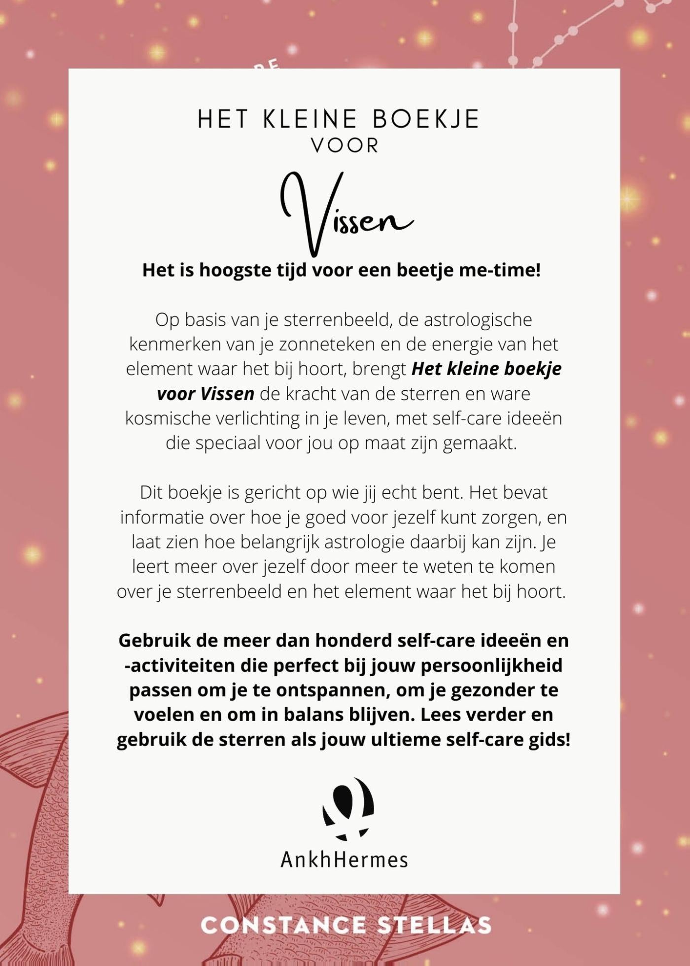 Het is hoogste tijd voor een beetje me-time! Op basis van je sterrenbeeld, de astrologische kenmerken van je zonneteken en de energie van het element waar het bij hoort, brengt Het kleine boekje voor Vissen de kracht van de sterren en ware kosmische verlichting in je leven, met self-care ideeën die speciaal voor jou op maat zijn gemaakt. Dit boekje is gericht op wie jij echt bent. Het bevat informatie over hoe je goed voor jezelf kunt zorgen, en laat zien hoe belangrijk astrologie daarbij kan zijn. Je leert meer over jezelf door meer te weten te komen over je sterrenbeeld en het element waar het bij hoort. Gebruik de meer dan honderd self-care ideeën en -activiteiten die perfect bij jouw persoonlijkheid passen om je te ontspannen, om je gezonder te voelen en om in balans blijven. Lees verder en gebruik de sterren als jouw ultieme self-care gids!