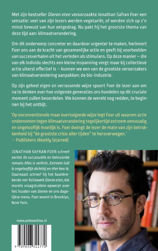 Met zijn bestseller Dieren eten veroorzaakte Jonathan Safran Foer een sensatie: veel van zijn lezers werden vegetariër, of werden zich op z'n minst bewust van hun eetgedrag, Nu pakt hij het grootste thema van deze tijd aan: klimaatverandering.