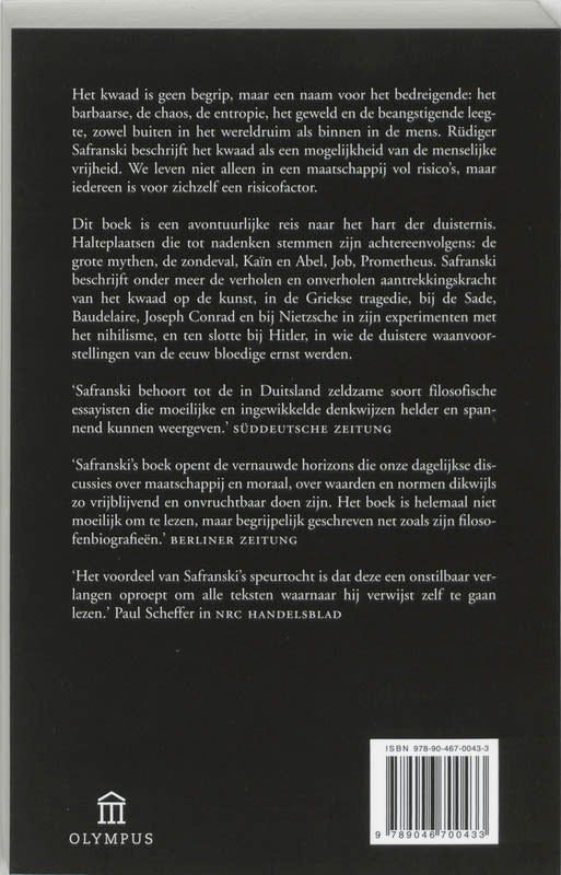 'Het kwaad' is geen begrip schrijft Rüdiger Safranski, maar een naam voor het bedreigende: het barbaarse, de chaos, de entropie, het geweld en de beangstigende leegte, zowel buiten in het wereldruim als binnen in de mens. Safranski beschrijft het kwaad als een mogelijkheid van de menselijke vrijheid. We leven niet alleen in een maatschappij vol risico’s, maar iedereen is voor zichzelf een risicofactor. Dit boek is een avontuurlijke reis naar het hart der duisternis. Halteplaatsen die tot nadenken stemmen zijn achtereenvolgens: de grote mythen, de zondeval, Kaïn en Abel, Job, Prometheus. Safranski beschrijft onder meer de verholen en onverholen aantrekkingskracht van het kwaad op de kunst, in de Griekse tragedie, bij de Sade, Baudelaire, Joseph Conrad en bij Nietzsche in zijn experimenten met het nihilisme, en ten slotte bij Hitler, in wie de duistere waanvoorstellingen van de eeuw bloedige ernst werden.