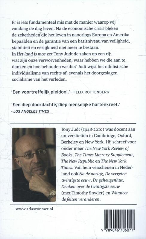 In Het land is moe zet Tony Judt de zaken op een rij wat betreft onze manier van leven, waar iets fundamenteel mis mee is. Wat zijn onze verworvenheden, waar hebben we die aan te danken en hoe behouden we die? Na de economische crisis bleken de zekerheden die het leven in naoorlogs Europa en Amerika bepaalden en de garantie van een basisniveau van veiligheid, stabiliteit en eerlijkheid niet meer te bestaan. Judt wijst het nihilistische individualisme van rechts af, evenals het doorgeslagen socialisme van het verleden.