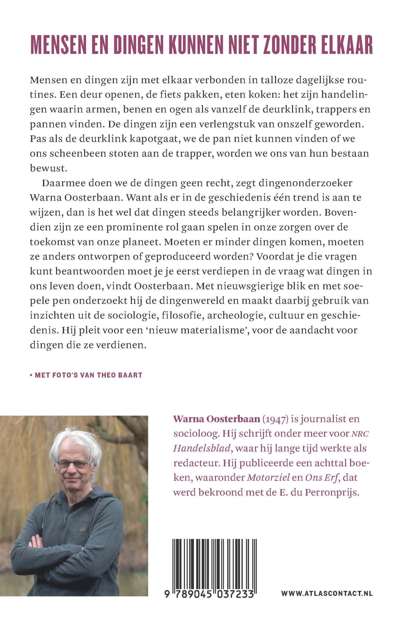 Dingen verdienen meer, zegt dingenonderzoeker Oosterbaan. Want als er in de geschiedenis één trend is aan te wijzen, dan is het wel dat dingen steeds belangrijker worden. Bovendien zijn ze een prominente rol gaan spelen in onze zorgen over de toekomst van onze planeet. Moeten er minder dingen komen, moeten ze anders ontworpen of geproduceerd worden? Moeten we minder achteloos met ze omgaan? Voordat je die vragen kunt beantwoorden moet je je eerst verdiepen in de vraag wat dingen in ons leven doen, vindt Oosterbaan. Met nieuwsgierige blik en met soepele pen onderzoekt hij de dingenwereld en maakt daarbij gebruik van inzichten uit de sociologie, filosofie, archeologie, cultuur en geschiedenis. Hij pleit voor een ‘nieuw materialisme’, voor de aandacht voor dingen die ze verdienen.