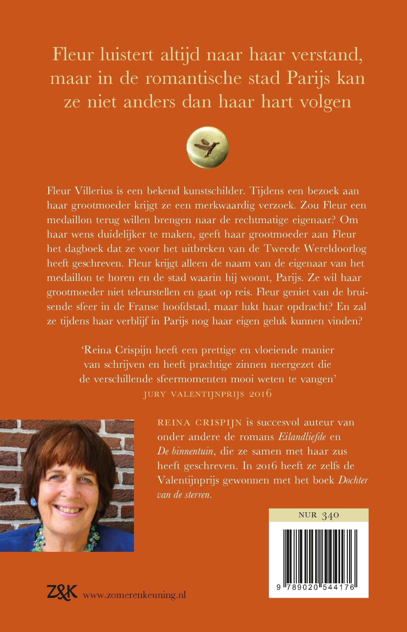 Als cartoonist en portretschilder Fleur in 'Het medaillon van Chagall' van Reina Crispijn op bezoek is bij haar grootmoeder, doet die haar een bijzonder verzoek: ze moet in Parijs op zoek gaan naar de rechtmatige eigenaar van een kostbaar fluwelen avondjasje en een medaillon. Hoe kan ze deze persoon ooit vinden? Ze krijgt een dagboek, waarin de geschiedenis van het medaillon beschreven staat. Tegen beter weten in vertrekt Fleur naar Parijs. Wat dat besluit in werking zet, verbaast en verwondert haar. 'Het medaillon van Chagall' is een schilderachtige roman van Reina Crispijn.