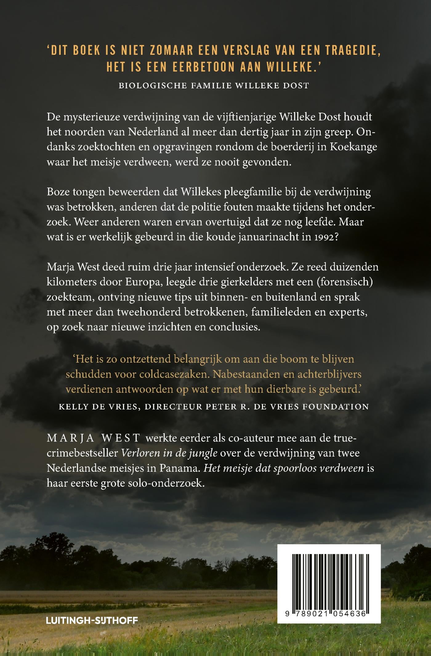 De mysterieuze verdwijning van Willeke Dost is na dertig jaar nog altijd niet opgelost, ondanks meerdere zoektochten en opgravingen rondom de boerderij in Koekange waar het meisje verdween. Marja West kreeg inzage in dossiers en sprak met getuigen, experts, familie en mensen uit de kring van het meisje die al dertig jaar zwijgen. Is Willekes pleegfamilie bij de verdwijning betrokken, zoals de Zoekgroep Willeke Dost denkt? Maakte de politie werkelijk fouten? Vertrok het meisje vrijwillig en leeft ze nog? Of is er iets heel anders gebeurd in die koude januarinacht in 1992?