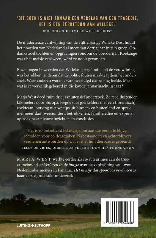 De mysterieuze verdwijning van Willeke Dost is na dertig jaar nog altijd niet opgelost, ondanks meerdere zoektochten en opgravingen rondom de boerderij in Koekange waar het meisje verdween. Marja West kreeg inzage in dossiers en sprak met getuigen, experts, familie en mensen uit de kring van het meisje die al dertig jaar zwijgen. Is Willekes pleegfamilie bij de verdwijning betrokken, zoals de Zoekgroep Willeke Dost denkt? Maakte de politie werkelijk fouten? Vertrok het meisje vrijwillig en leeft ze nog? Of is er iets heel anders gebeurd in die koude januarinacht in 1992?