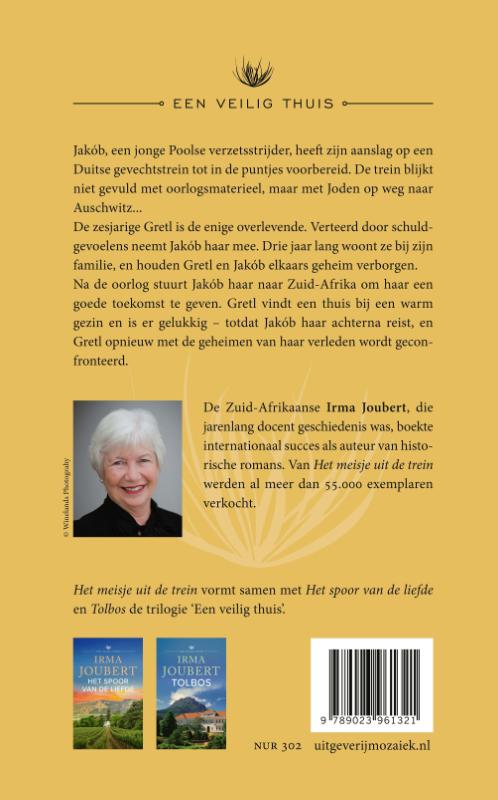 'Het meisje uit de trein' is de bekendste en meest geliefde roman van Irma Joubert. Kleine Gretl ontsnapt uit de trein naar Auschwitz, wordt door de Poolse Jakób onder zijn hoede genomen en belandt later in Zuid-Afrika. Een meeslepend verhaal over oorlog, bevrijding en liefde.