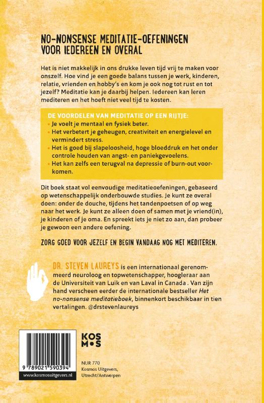 In het 'no-nonsense meditatie oefenboek' van Steven Laureys staan 50 meditatieoefeningen van slechts 10 minuten die iedereen overal kan doen: onder de douche, tijdens het tandenpoetsen of op weg naar het werk… Wetenschappelijk toegelicht en doorspekt met persoonlijke anekdotes.