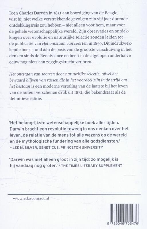 Het ontstaan van soorten van Charles Darwin stond aan de basis van de grootste verschuiving in het denken sinds de Renaissance, en heeft in de afgelopen anderhalve eeuw nog niets aan zeggingskracht verloren. Toen Darwin in 1831 aan boord ging van de Beagle wist hij niet welke verstrekkende gevolgen zijn vijf jaar durende ontdekkingsreis zou hebben, niet alleen voor hem, maar voor de gehele wetenschappelijke wereld. Zijn observaties en ontdekkingen over evolutie en natuurlijke selectie zouden leiden tot de publicatie van Het ontstaan van soorten in 1859. Dit indrukwekkende boek, over het bewaard blijven van rassen die in het voordeel zijn in de strijd om het bestaan, is een moderne vertaling van de laatste bij leven van de auteur verschenen druk uit 1872, die bekend staat als de definitieve editie.