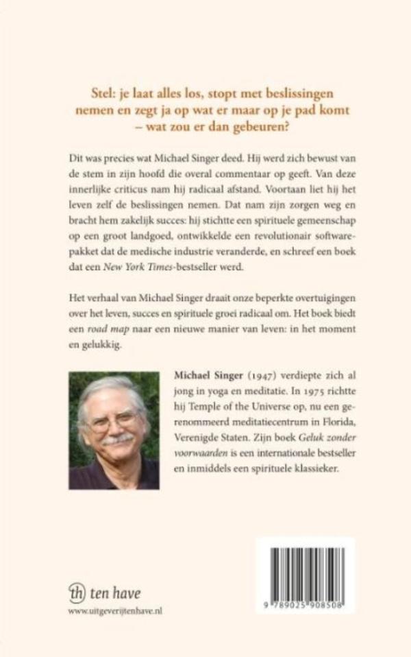 Dit was precies wat Michael Singer deed. Hij werd zich bewust van de stem in zijn hoofd die overal commentaar op geeft. Van deze innerlijke criticus nam hij radicaal afstand. Voortaan liet hij het leven zelf de beslissingen nemen. Dat nam zijn zorgen weg en bracht hem zakelijk succes: hij stichtte een spirituele gemeenschap op een groot landgoed, ontwikkelde een revolutionair softwarepakket dat de medische industrie veranderde, en schreef een boek dat een New York Times-bestseller werd.