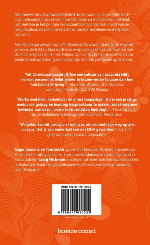 Het Oz-principe van Tom Smith laat haarfijn zien hoe je het principe van accountability onderdeel maakt van de bedrijfscultuur. Als medewerkers zich verantwoordelijk voelen voor hun eigen werk en de organisatiedoelen, zijn ze veel meer betrokken en wint iedereen. Waardoor resultaten ook aanzienlijk verbeteren en werkplezier toeneemt. Dit boek inspireert met herkenbare voorbeelden om een nieuwe manier van denken te implementeren en zaken anders aan te pakken, precies wat nodig is in dit tijdperk van snelle verandering.