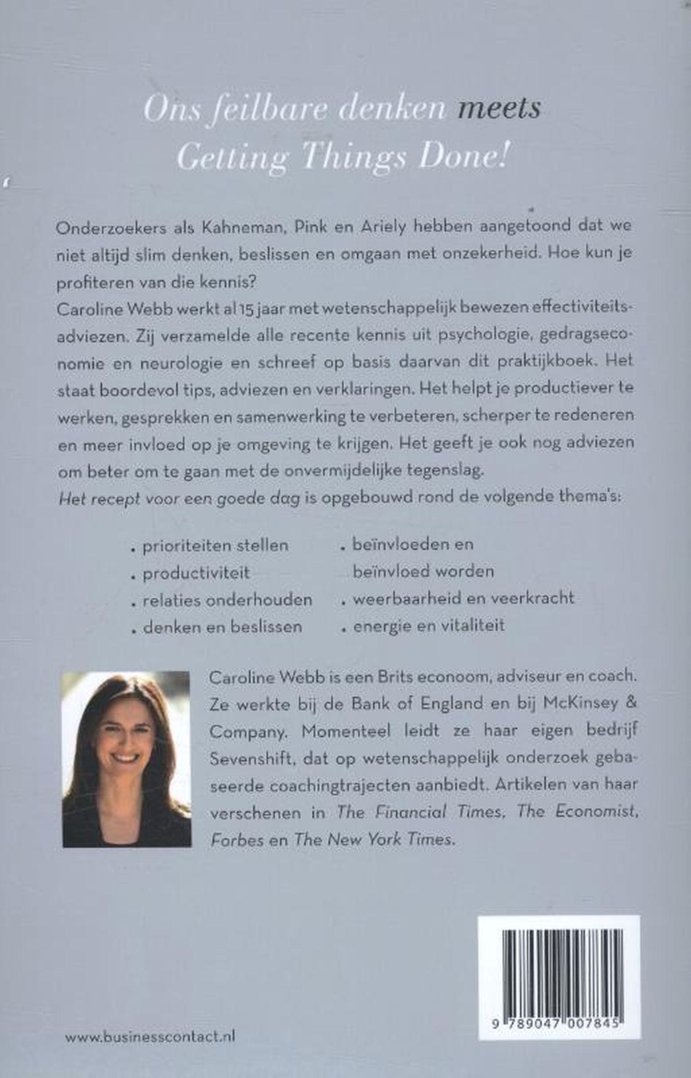 Caroline Webb werkt al vijftien jaar met wetenschappelijk bewezen effectiviteitsadviezen. Zij verzamelde alle recente kennis op het gebied van psychologie, gedragseconomie en neurologie en schreef op basis daarvan dit praktijkboek. Het staat boordevol tips, adviezen en verklaringen. Het helpt je productiever te werken, gesprekken en samenwerking te verbeteren, scherper te redeneren en meer invloed op je omgeving te krijgen. Het geeft je ook nog adviezen om beter om te gaan met de onvermijdelijke tegenslag.