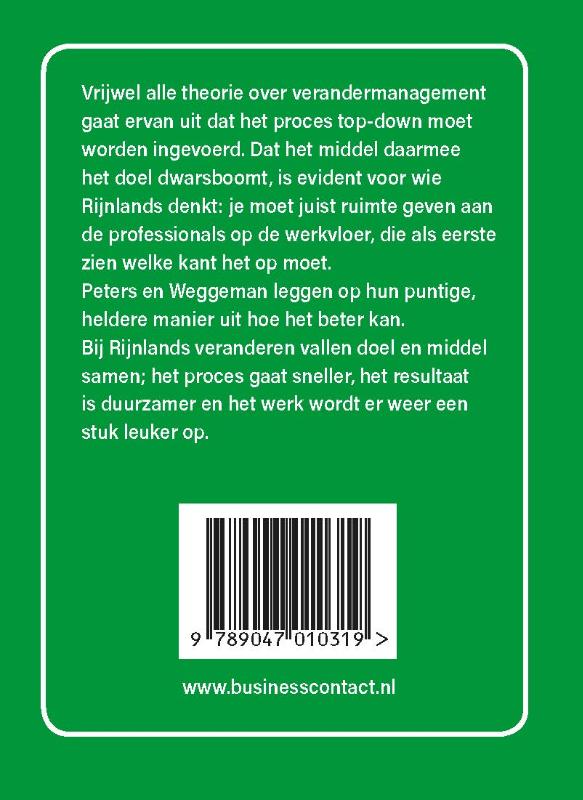 In 'Het Rijnlands veranderboekje' leggen veteranen Jaap Peters en Matthieu Weggeman op een puntige en heldere manier uit hoe veranderen beter kan. Want vrijwel alle theorie over verandermanagement gaat ervan uit dat het proces top-down moet worden ingevoerd. Dat het middel daarmee het doel dwarsboomt, is evident voor wie Rijnlands denkt: je moet juist ruimte geven aan de professionals op de werkvloer, die als eerste zien welke kant het op moet.