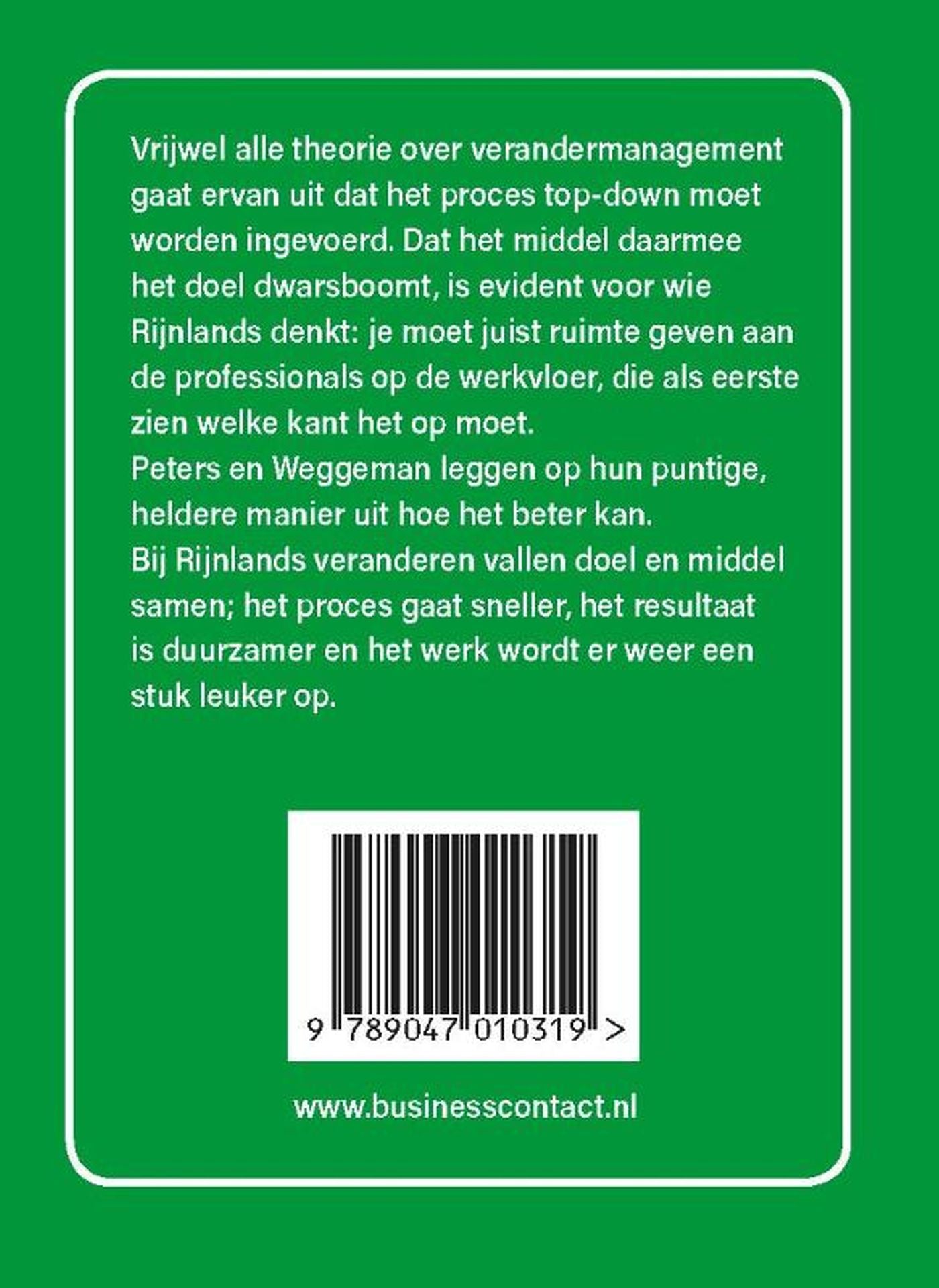 In ‘Het Rijnlands veranderboekje’ leggen veteranen Jaap Peters en Matthieu Weggeman op een puntige en heldere manier uit hoe veranderen beter kan. Want vrijwel alle theorie over verandermanagement gaat ervan uit dat het proces top-down moet worden ingevoerd. Dat het middel daarmee het doel dwarsboomt, is evident voor wie Rijnlands denkt: je moet juist ruimte geven aan de professionals op de werkvloer, die als eerste zien welke kant het op moet.