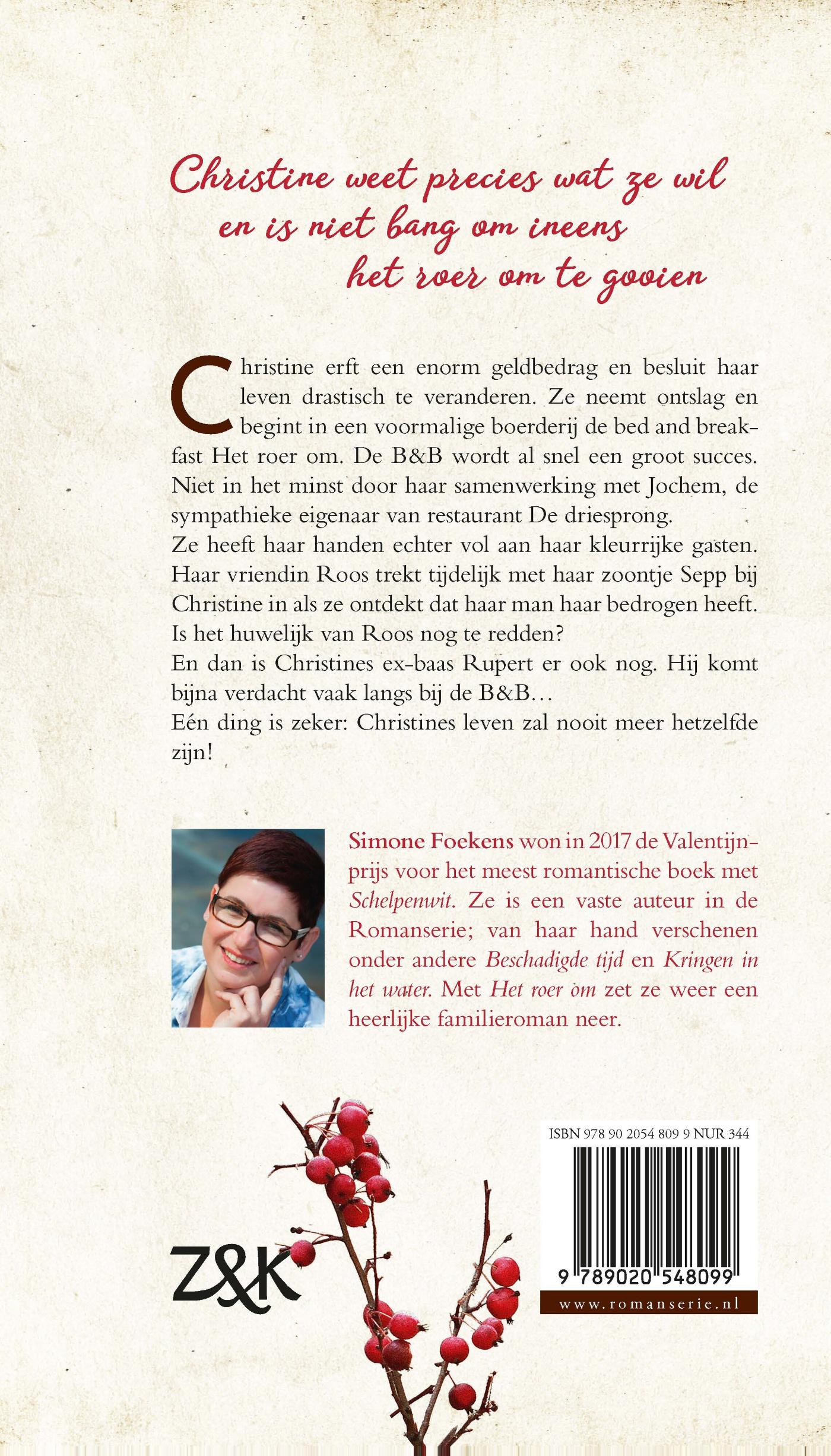 In 'Het roer om' van Simone Foekens erft Christine een enorm geldbedrag en ze besluit haar leven om te gooien. Ze neemt ontslag, verhuist naar Twente en begint in een een oude boerderij een bed and breakfast. De zaken lopen al snel goed en ze gaat een samenwerkingsverband aan met Jochem, de eigenaar van een restaurant. Naast het gezelschap van Jochem heeft Christine het meer dan druk met al haar kleurrijke B&B-gasten.