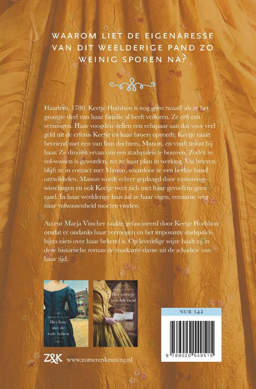 Auteur Marja Visscher raakte gefascineerd door Keetje Hodshon omdat er ondanks haar vermogen en het imposante stadspaleis bijna niets over haar bekend is. Op levendige wijze haalt zij in deze historische roman de markante dame uit de schaduw van haar tijd.