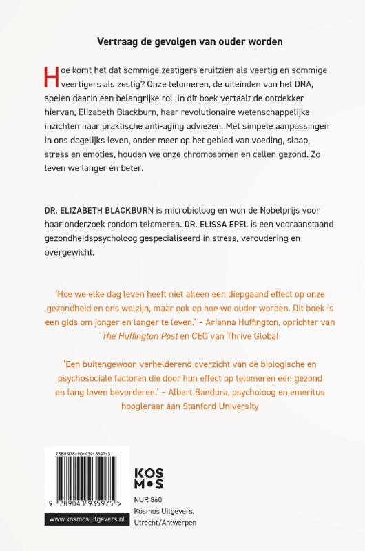 Hoe komt het dat sommige zestigers eruitzien als veertig en sommige veertigers als zestig? Onze telomeren, de uiteinden van het DNA, spelen daarin een belangrijke rol. Elizabeth Blackburn ontdekte dit en won de Nobelprijs voor haar onderzoek. In dit boek laat ze zien hoe we met simpele aanpassingen in onze dagelijkse gewoonten onze chromosomen en cellen gezond houden zo leven we langer én beter.