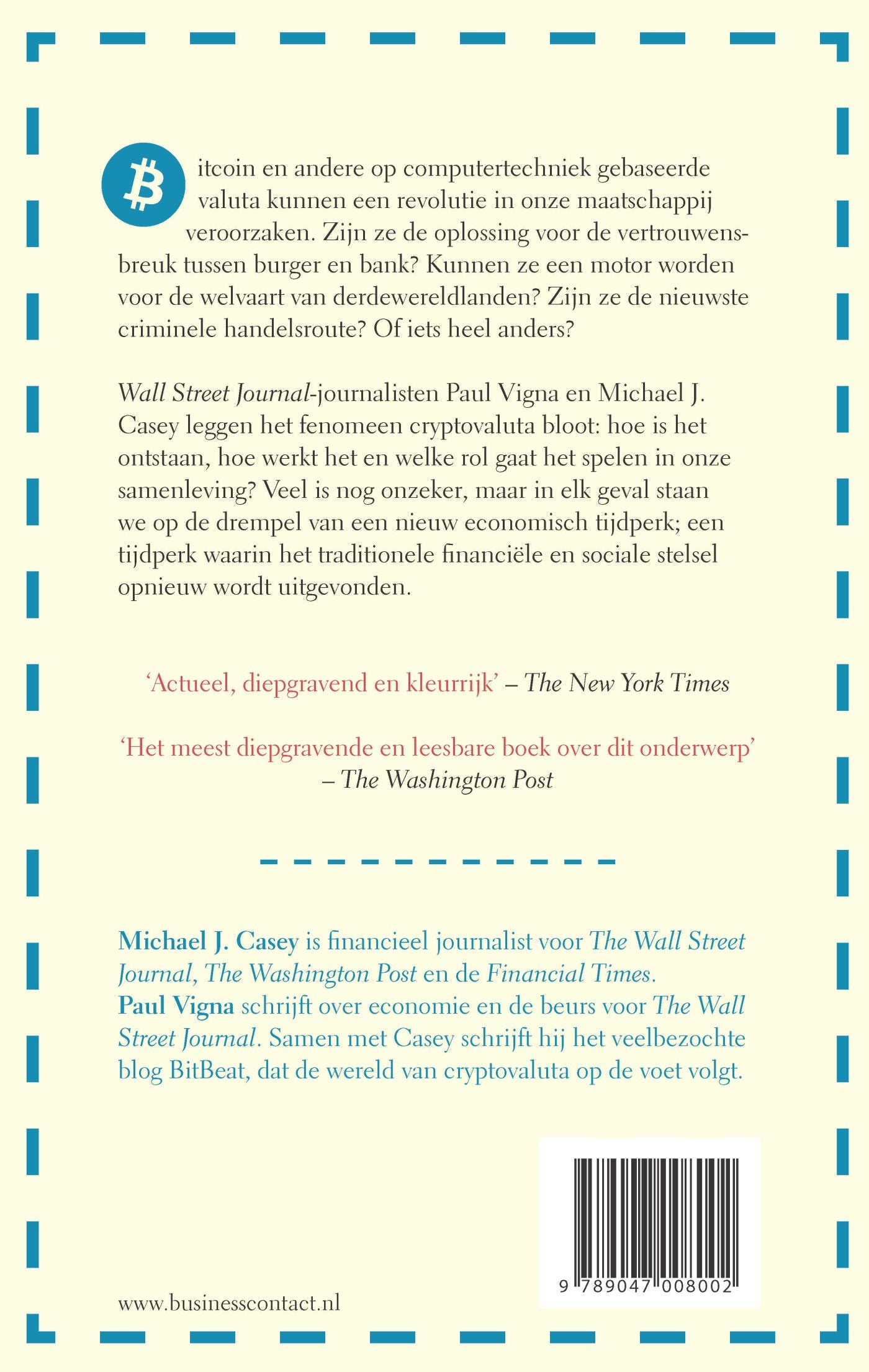 Bitcoin en andere op computertechniek gebaseerde valuta kunnen een revolutie in onze maatschappij veroorzaken. Zijn ze de oplossing voor de vertrouwensbreuk tussen burger en bank? Kunnen ze een motor worden voor de welvaart van derdewereldlanden? Zijn ze de nieuwste criminele handelsroute? Of iets heel anders? Wall Street Journal-journalisten Paul Vigna en Michael J. Casey leggen het fenomeen cryptovaluta bloot: hoe is het ontstaan, hoe werkt het en welke rol gaat het spelen in onze samenleving? Veel is nog onzeker, maar in elk geval staan we op de drempel van een nieuw economisch tijdperk; een tijdperk waarin het traditionele financiële en sociale stelsel opnieuw wordt uitgevonden.