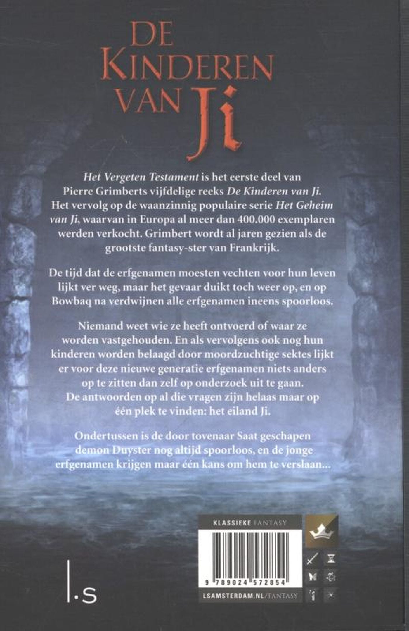 Het Vergeten Testament is het eerste deel van Pierre Grimberts vijfdelige reeks De Kinderen van Ji. Het vervolg op de waanzinnig populaire serie Het Geheim van Ji, waarvan in Europa al meer dan 400.000 exemplaren werden verkocht. Grimbert wordt al jaren gezien als de grootste fantasy-ster van Frankrijk.