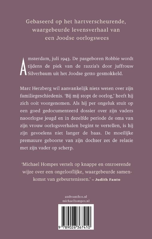 Amsterdam, juli 1943. De pasgeboren Robbie wordt tijdens de piek van de razzia’s door juffrouw Silverbaum uit het Joodse getto gesmokkeld. Marc Herzberg wil aanvankelijk niets weten over zijn familiegeschiedenis. ‘Bij mij stopt de oorlog,’ heeft hij zich ooit voorgenomen. Als hij per ongeluk stuit op een goed gedocumenteerd dossier over zijn vaders naoorlogse jeugd en in dezelfde periode de oma van zijn vrouw oorlogsverhalen begint te vertellen, is hij zijn gevoelens niet langer de baas. De moeilijke premature geboorte van zijn dochter zet de relatie met zijn vader op scherp.