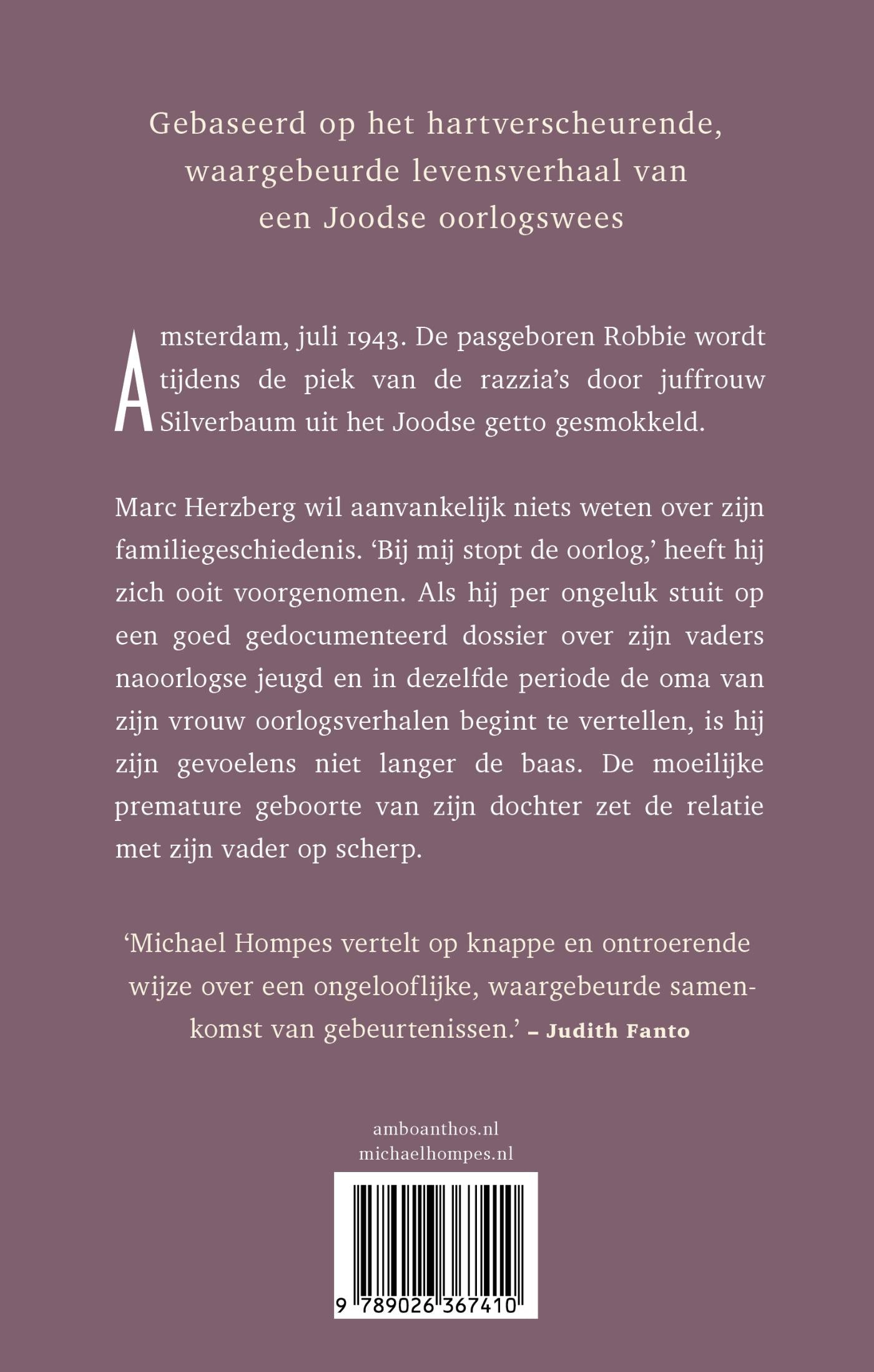 Amsterdam, juli 1943. De pasgeboren Robbie wordt tijdens de piek van de razzia’s door juffrouw Silverbaum uit het Joodse getto gesmokkeld. Marc Herzberg wil aanvankelijk niets weten over zijn familiegeschiedenis. ‘Bij mij stopt de oorlog,’ heeft hij zich ooit voorgenomen. Als hij per ongeluk stuit op een goed gedocumenteerd dossier over zijn vaders naoorlogse jeugd en in dezelfde periode de oma van zijn vrouw oorlogsverhalen begint te vertellen, is hij zijn gevoelens niet langer de baas. De moeilijke premature geboorte van zijn dochter zet de relatie met zijn vader op scherp.