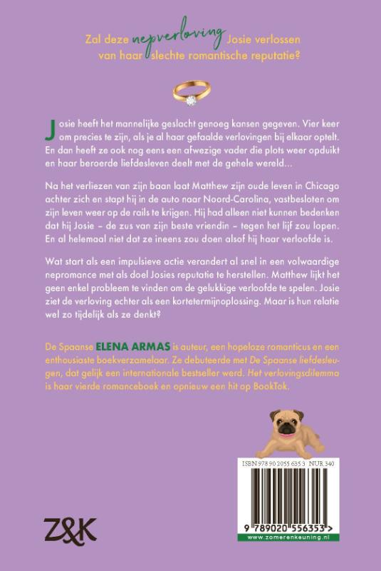 In de pakkende romcom 'Het verlovingsdilemma' van Elena Armas is Josie wel een beetje klaar met de liefde na vier mislukte verlovingen. Wanneer haar vader zijn pensionering aan wil kondigen met een artikel over de familie, realiseert Josie zich dat haar liefdesverleden een ingewikkelde PR-kwestie is. Gelukkig kan Matthew, de beste vriend van haar zus, haar uit de brand helpen. Wat begint als een misverstand, leidt tot een afspraak waarbij de twee zich voordoen als gelukkige verloofden. Maar is hun relatie wel zo tijdelijk als ze denken? 'Het verlovingsdilemma' is een heerlijke romance van Elena Armas. Eerder verscheen van haar 'De Spaanse liefdesleugen', 'Het Amerikaanse datingexperiment' en 'Liefde in het spel', waar 'Het verlovingsdilemma' een los te lezen vervolg op is.