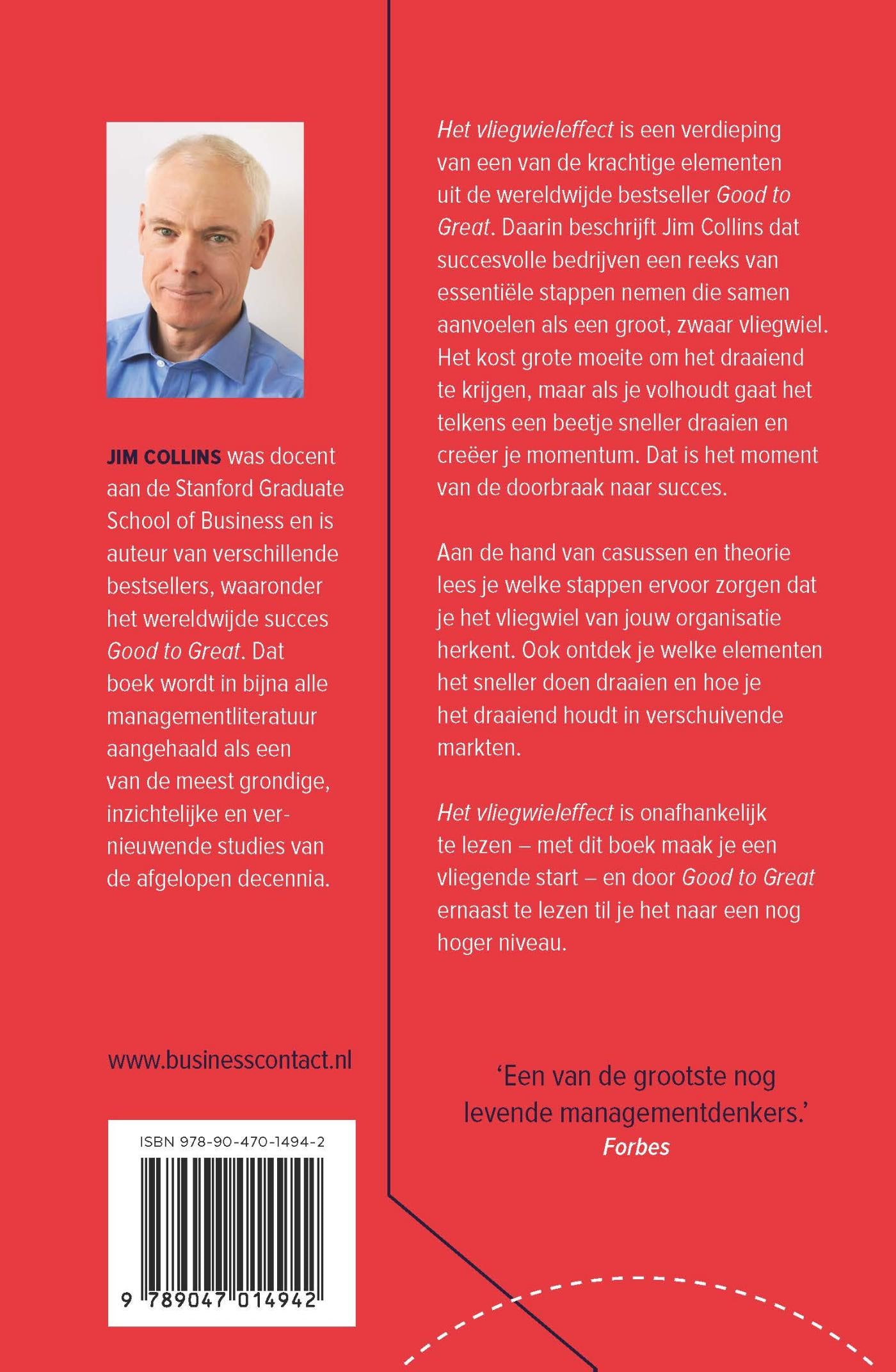 ‘Het vliegwieleffect’ van Jim Collins is een verdieping van een van de krachtige elementen uit de wereldwijde bestseller ‘Good to Great’. Daarin beschrijft Jim Collins dat succesvolle bedrijven een reeks van essentiële stappen nemen die samen aanvoelen als een groot, zwaar vliegwiel. Het kost grote moeite om het draaiend te krijgen, maar als je volhoudt gaat het telkens een beetje sneller draaien en creëer je momentum. Dat is het moment van de doorbraak naar succes.