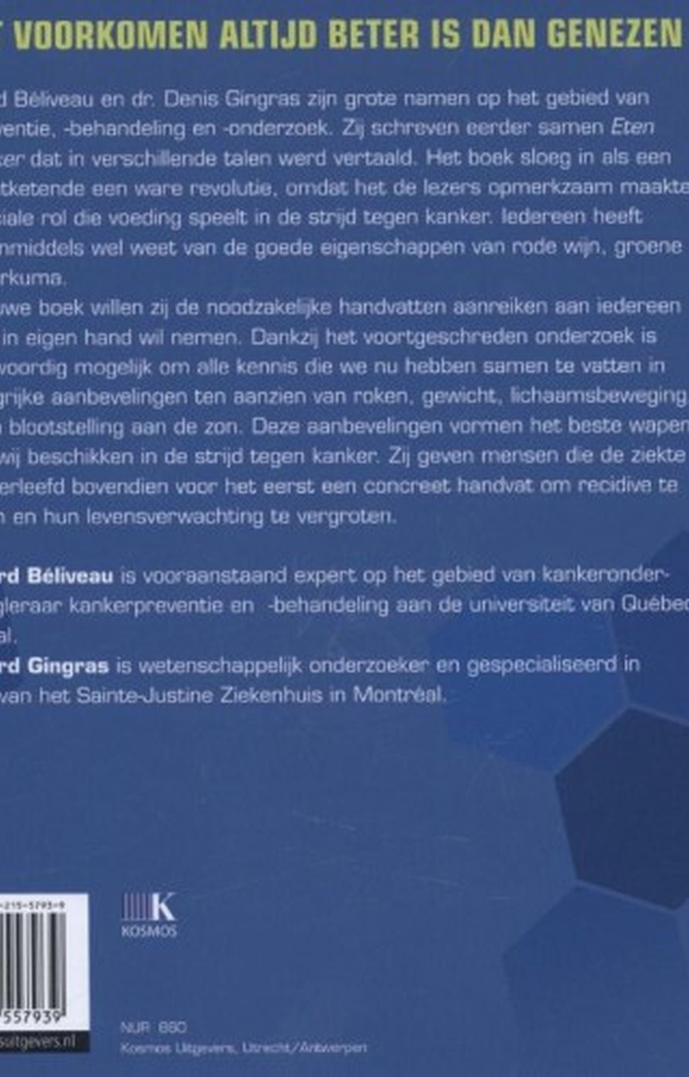 Let op dit eboek is NIET geschikt vpoor zwart-wit e-readers. De diagnose kanker legt een bom onder het leven van velen. Het genezingsproces is lang en ingrijpend, als je al geneest. Zo’n 70% van de kankersoorten is te voorkomen. De crux ligt hem in de juiste voeding en beweging. En het vermijden van factoren die kanker bespoedigen (roken, alcohol, overmatige zon etc.) in dit uitgebreide handboek worden de laatste wetenschappelijke inzichten op dit gebied toegankelijk besproken. Het boek werd geschreven door Richard Béliveau en Denis Gingras, ook bekend van de bestsellers Eten tegen kanker en het Eten tegen kanker kookboek.