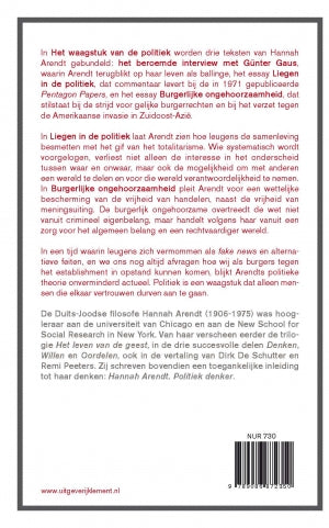 Hannah Arendt confronteert ons in Het waagstuk van de politiek met de vraag hoe we moeten omgaan met liegende politici. Wat mogen we doen wanneer die politici de democratische rechtsstaat in gevaar brengen? Het waagstuk van de politiek bevat niet eerder in het Nederlands vertaalde essays en een uniek interview met Günter Gaus. Arendt's ideeën zijn actueler dan ooit. Op erudiete wijze fileert ze niet alleen het gedrag van politici, maar ook dat van ons burgers.