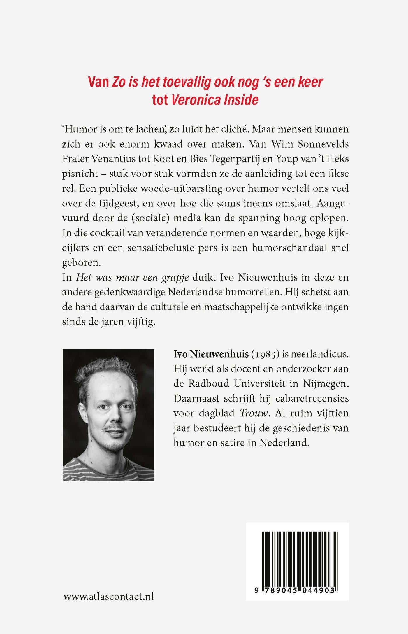 In Het was maar een grapje duikt Ivo Nieuwenhuis in deze en andere gedenkwaardige Nederlandse humorrellen. Hij schetst aan de hand daarvan de culturele en maatschappelijke ontwikkelingen sinds de jaren vijftig.
