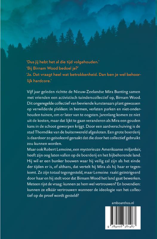 Vijf jaar geleden richtte de Nieuw-Zeelandse Mira Bunting samen met vrienden een activistisch tuinderscollectief op, Birnam Wood. Dit ongeregelde collectief van bevriende kunstenaars plant gewassen op verwilderde plekken: in bermen, verlaten parken en niet-onderhouden tuinen, om er later van te oogsten. Jarenlang komen ze niet uit de kosten, maar dat lijkt te gaan veranderen als Mira een gouden kans in de schoot geworpen krijgt. Door een aardverschuiving is de stad Thorndike van de buitenwereld afgesloten. Een grote boerderij is daardoor zo geïsoleerd geraakt dat die door het collectief gebruikt zou kunnen worden.