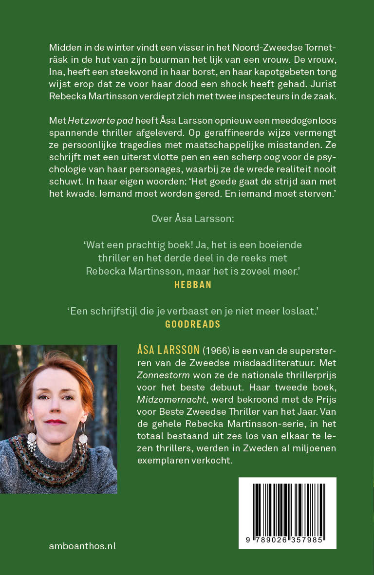 Het zwarte pad van Zweedse bestsellerauteur Åsa Larsson is het derde deel van de Rebecka Martinsson-serie. Midden in de winter vindt een visser in het Noord-Zweedse Torneträsk het lijk van een vrouw in de hut van zijn buurman. De vrouw, Ina, heeft een steekwond in haar borst, maar haar kapotgebeten tong wijst erop dat ze voor haar dood een shock heeft gehad. Juriste Rebecka Martinsson verdiept zich met twee inspecteurs in de zaak.