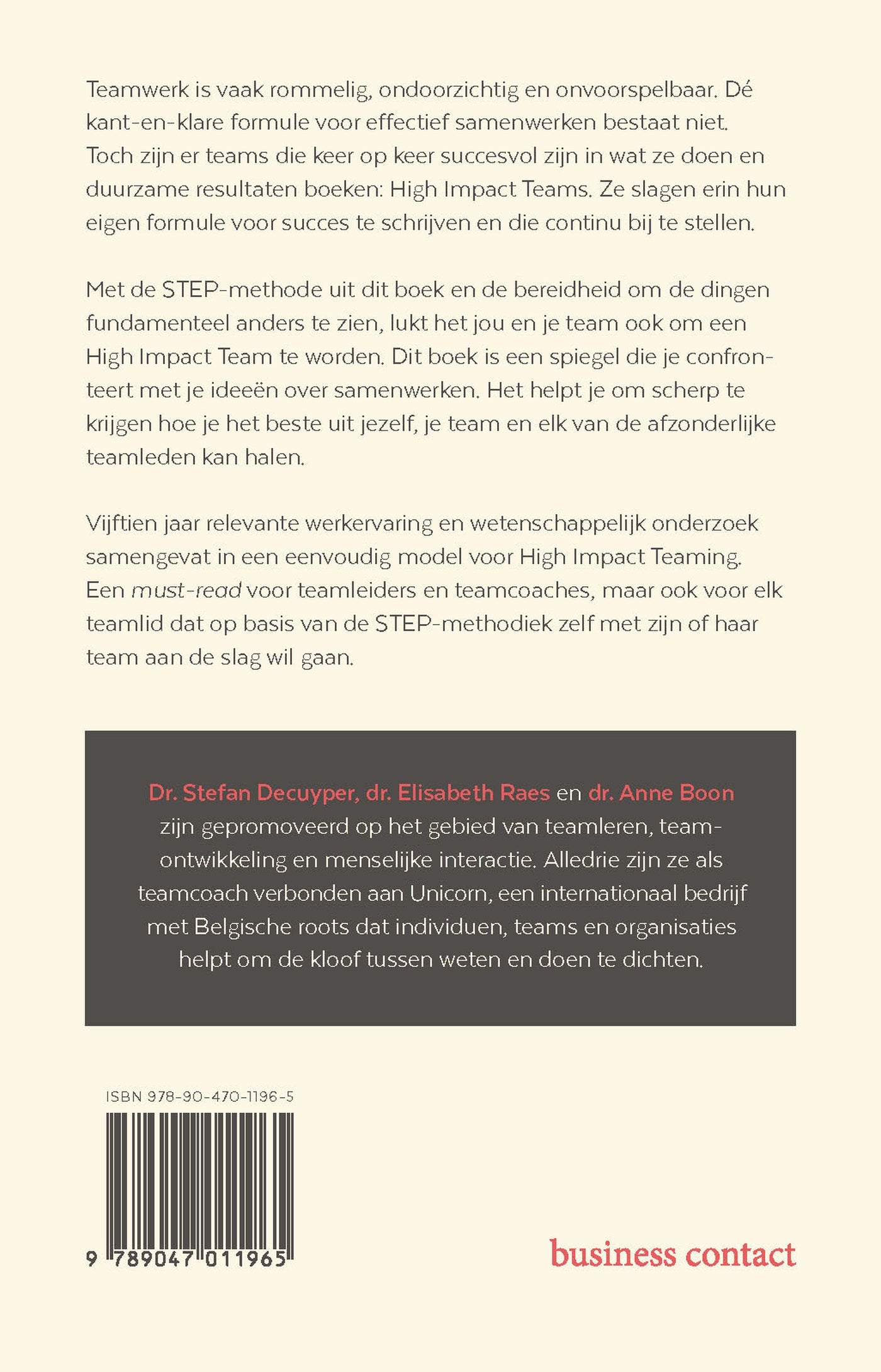 Met de STEP-methode uit dit boek en de bereidheid om de dingen fundamenteel anders te zien, lukt het jou en je team ook om een High Impact Team te worden. Dit boek is een spiegel die je confronteert met je ideeën over samenwerken. Het helpt je om scherp te krijgen hoe je het beste uit jezelf, je team en elk van de afzonderlijke teamleden kan halen.