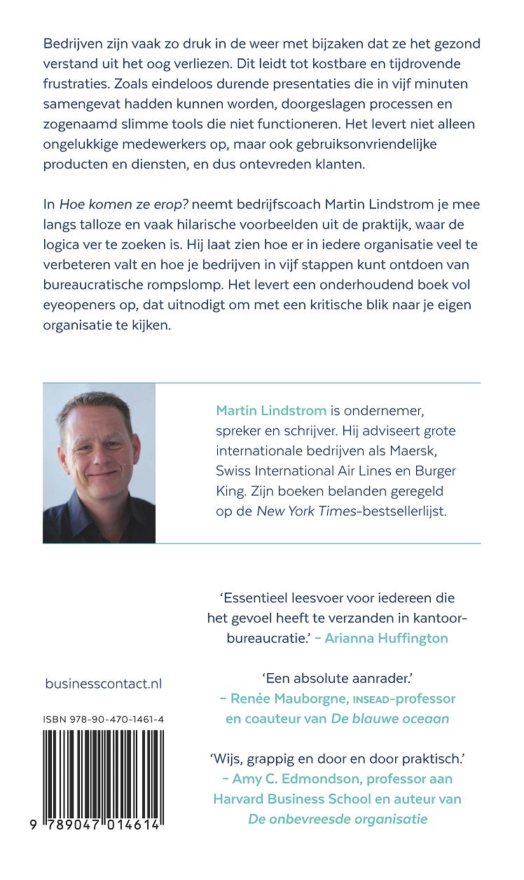 Lindstrom neemt je in ‘Hoe komen ze erop?’ mee langs talloze en vaak hilarische voorbeelden uit de praktijk, waar de logica ver te zoeken is. Hij laat zien hoe er in iedere organisatie veel te verbeteren valt en hoe je bedrijven in vijf stappen kunt ontdoen van