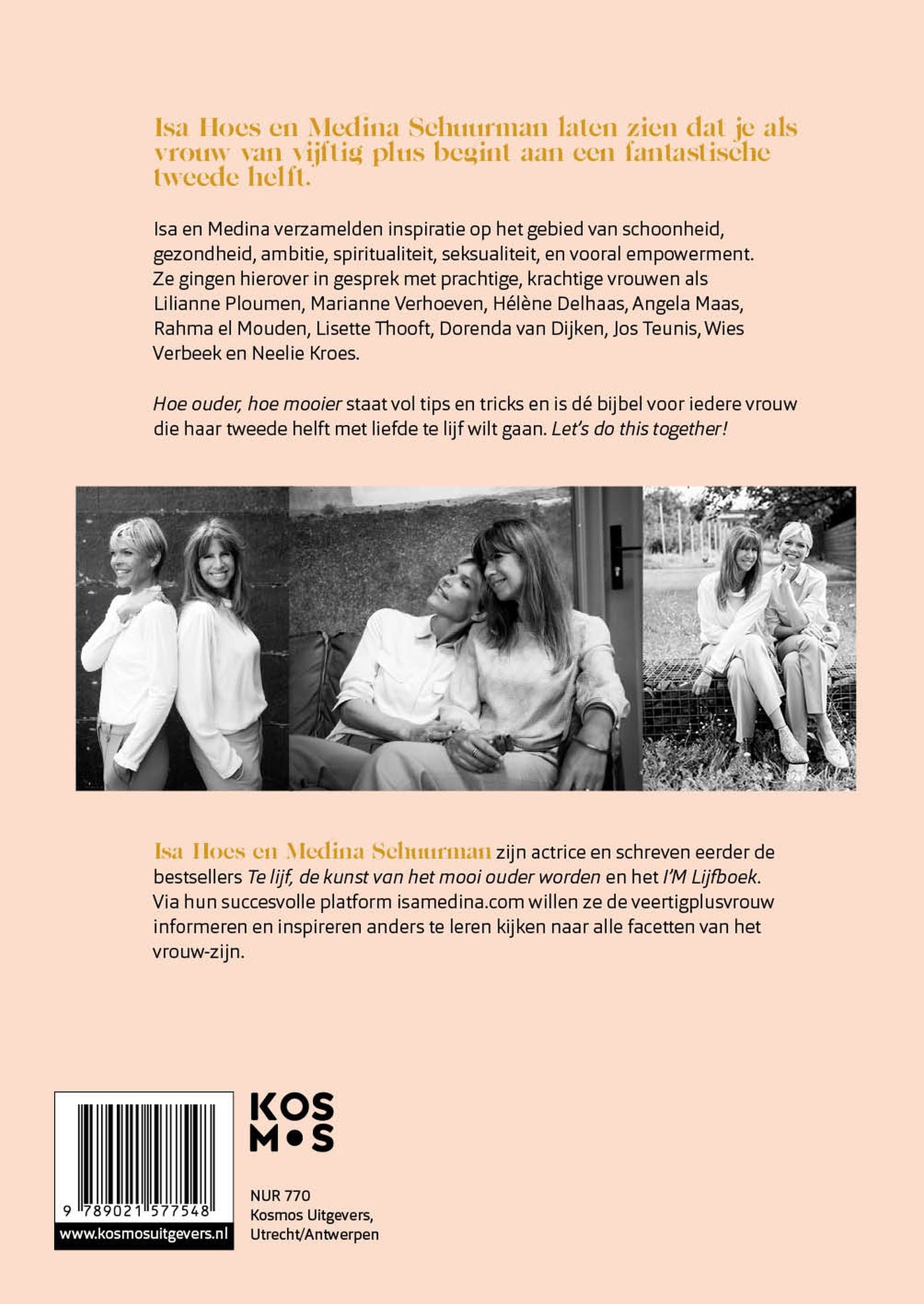 Isa Hoes en Medina Schuurman laten in Hoe ouder hoe mooier zien dat je als vrouw van 50 jaar of ouder juist begint aan een fantastische tweede helft! Ze hebben daarvoor de hulp ingeroepen van mooie, sterke en krachtige vrouwen als Hélène Delhaas, Liliane Ploumen, Lizette Thooft, Marianne Verhoeven, Angela Maas, Rahma el Mouden en Neelie Kroes. Uit de gesprekken die zij voerden met deze vrouwen verzamelden Isa en Medina inspiratie op het gebied van schoonheid, gezondheid, spiritualiteit, seksualiteit en vooral empowerment. Een boek boordevol herkenbare verhalen en praktische tips voor iedere vrouw die knetterknap de barricades op wil gaan.