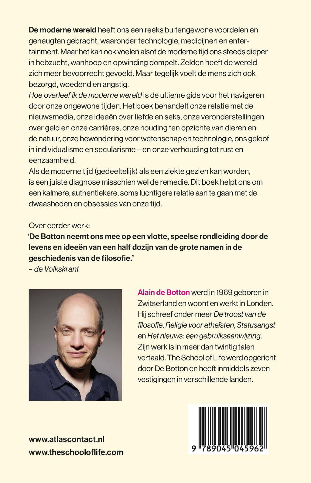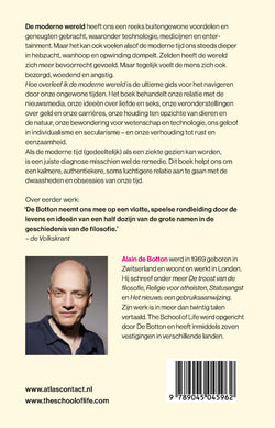 ‘Hoe overleef ik de moderne wereld” van Alain de Botton & The School of Life is de ultieme gids voor het navigeren door onze ongewone tijden. Het boek behandelt onze relatie met de nieuwsmedia, onze ideeën over liefde en seks, onze veronderstellingen over geld en onze carrières, onze houding ten opzichte van dieren en de natuur, onze bewondering voor wetenschap en technologie, ons geloof in individualisme en secularisme – en onze verhouding tot rust en eenzaamheid.